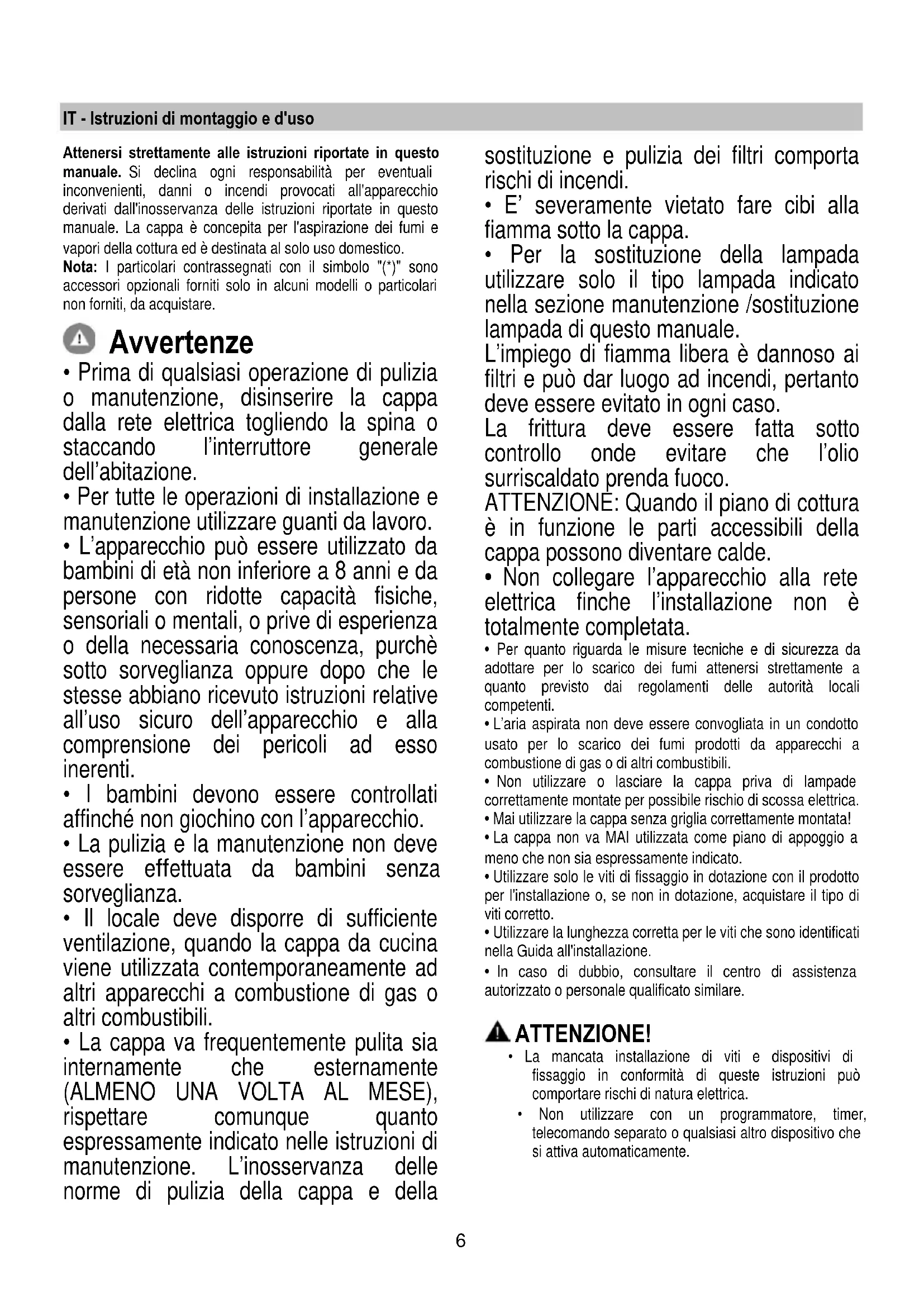- Non utilizzare o lasciare la cappa priva di lampade correttamente montate per possibile rischio di scossa elettrica.