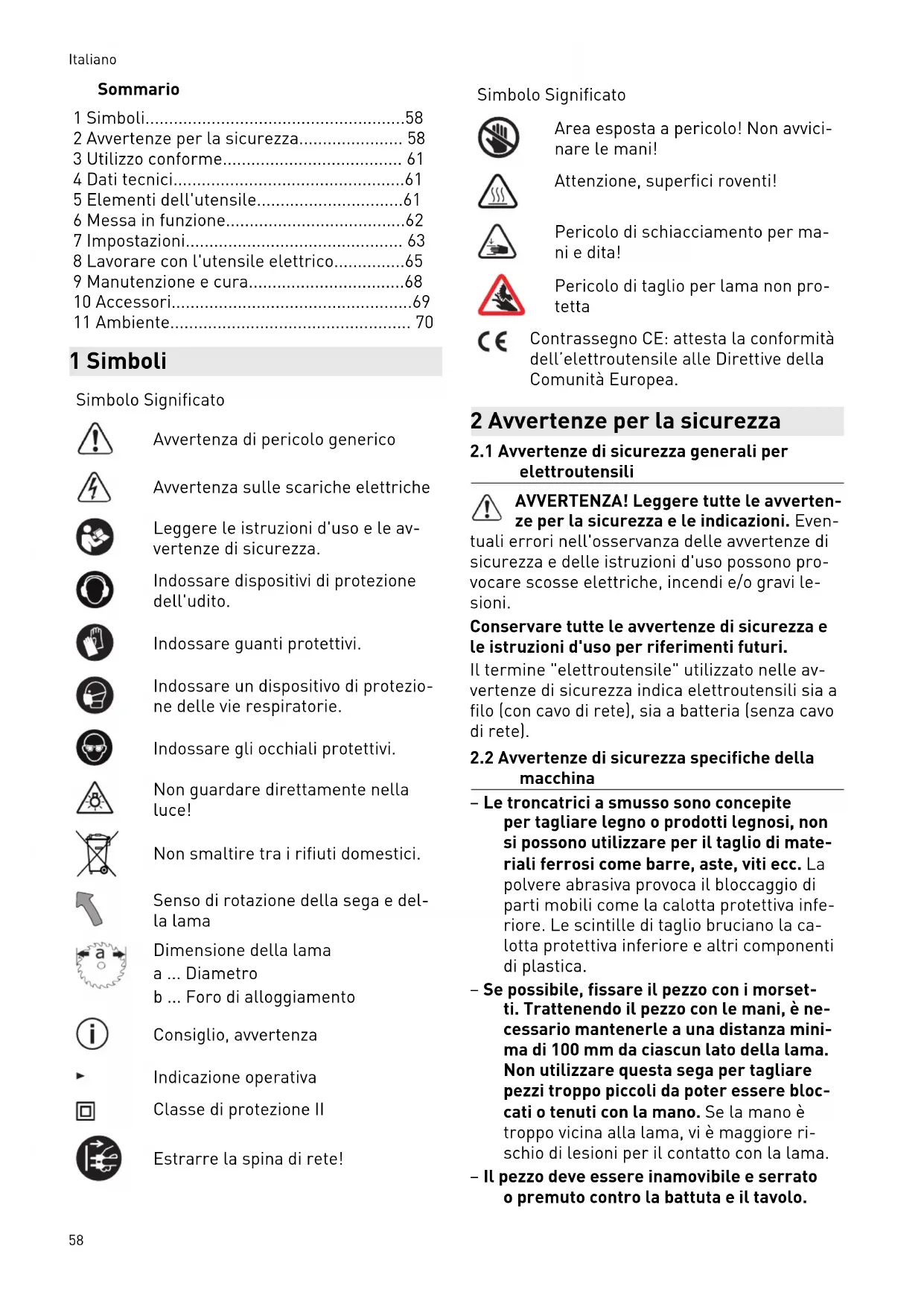 - 11 Ambiente 1 Simboli Simbolo Significato Avvertenza di pericolo generico Avvertenza sulle scariche elettriche Leggere le istruzioni d'uso e le av vertenze di sicurezza. Indossare dispositivi di protezione dell'udito. Indossare guanti protettivi. Indossare un dispositivo di protezio ne delle vie respiratorie. Indossare gli occhiali protettivi. Non guardare direttamente nella luce! Non smaltire tra i rifiuti domestici. Senso di rotazione della sega e del la lama Dimensione della lama a Diametro b Foro di alloggiamento Consiglio, avvertenza Indicazione operativa Classe di protezione II Estrarre la spina di rete! Simbolo Significato Area esposta a pericolo! Non avvici nare le mani! Attenzione, superfici roventi! Pericolo di schiacciamento per ma ni e dita! Pericolo di taglio per lama non pro tetta Contrassegno CE: attesta la conformità dell’elettroutensile alle Direttive della Comunità Europea. 2 Avvertenze per la sicurezza p. 70
