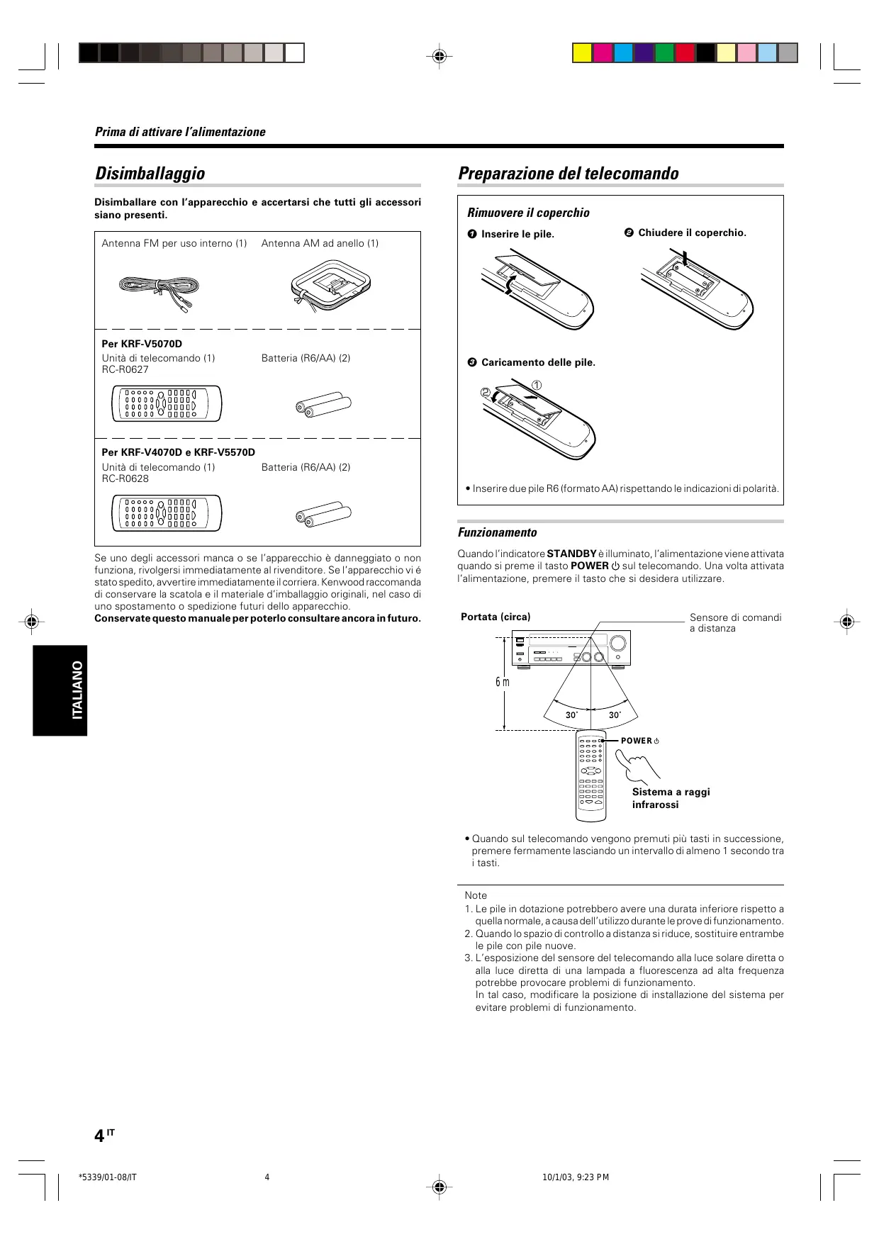 Per KRF-V4070D e KRF-V5570D Unità di telecomando (1) Batteria (R6/AA) (2) RC-R0628 • Inserire due pile R6 (formato AA) rispettando le indicazioni di polarità.