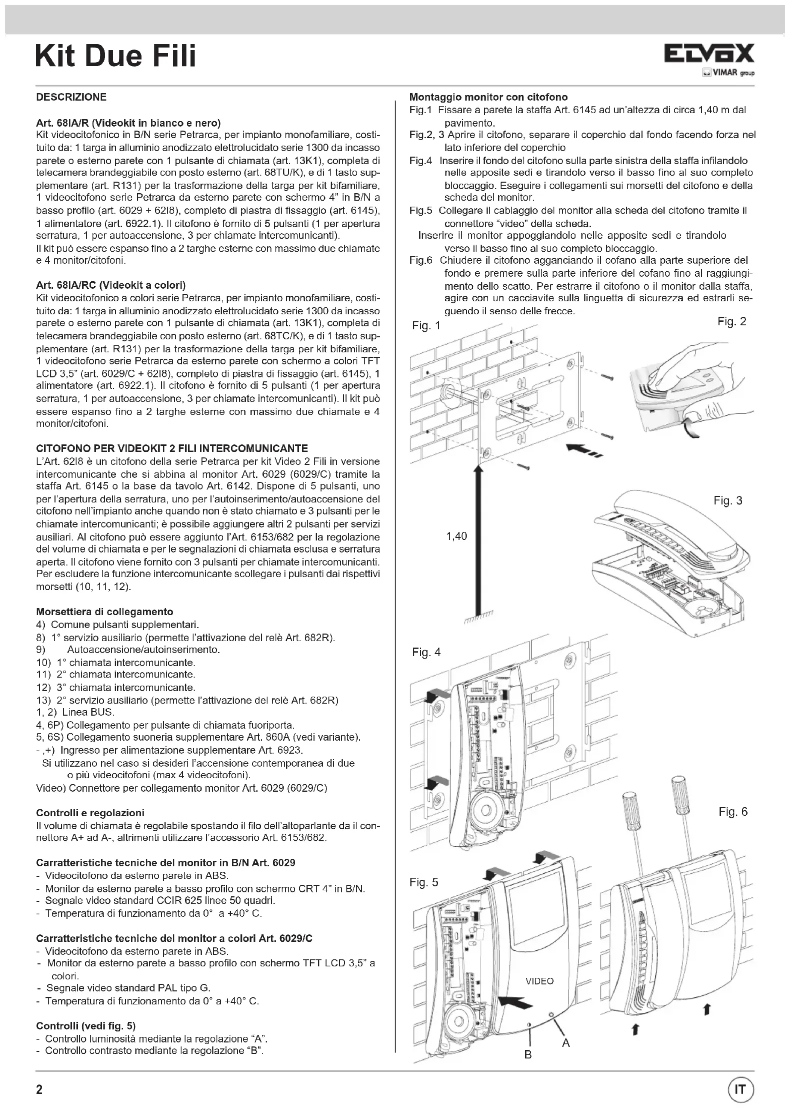 1, 2) Linea BUS. 4, 6P) Collegamento per pulsante di chiamata fuoriporta. 5, 6S) Collegamento suoneria supplementare Art. 860A (vedi variante). - ,+) Ingresso per alimentazione supplementare Art. 6923. Si utilizzano nel caso si desideri l’accensione contemporanea di due o più videocitofoni (max 4 videocitofoni). Video) Connettore per collegamento monitor Art. 6029 (6029/C) Controlli e regolazioni Il volume di chiamata è regolabile spostando il filo dell’altoparlante da il con- nettore A+ ad A-, altrimenti utilizzare l’accessorio Art. 6153/682. Carratteristiche tecniche del monitor in B/N Art. 6029 - Videocitofono da esterno parete in ABS. - Monitor da esterno parete a basso profilo con schermo CRT 4” in B/N. - Segnale video standard CCIR 625 linee 50 quadri. - Temperatura di funzionamento da 0° a +40° C. Carratteristiche tecniche del monitor a colori Art. 6029/C - Videocitofono da esterno parete in ABS. - Monitor da esterno parete a basso profilo con schermo TFT LCD 3,5” a colori. - Segnale video standard PAL tipo G. - Temperatura di funzionamento da 0° a +40° C. Controlli (vedi fig. 5) - Controllo luminosità mediante la regolazione “A”. - Controllo contrasto mediante la regolazione “B”. Montaggio monitor con citofono Fig.1 Fissare a parete la staffa Art. 6145 ad un’altezza di circa 1,40 m dal pavimento. Fig.2, 3 Aprire il citofono, separare il coperchio dal fondo facendo forza nel lato inferiore del coperchio Fig.4 Inserire il fondo del citofono sulla parte sinistra della staffa infilandolo nelle apposite sedi e tirandolo verso il basso fino al suo completo bloccaggio. Eseguire i collegamenti sui morsetti del citofono e della scheda del monitor. Fig.5 Collegare il cablaggio del monitor alla scheda del citofono tramite il connettore “video” della scheda. Inserire il monitor appoggiandolo nelle apposite sedi e tirandolo verso il basso fino al suo completo bloccaggio. Fig.6 Chiudere il citofono agganciando il cofano alla parte superiore del fondo e premere sulla parte inferiore del cofano fino al raggiungi- mento dello scatto. Per estrarre il citofono o il monitor dalla staffa, agire con un cacciavite sulla linguetta di sicurezza ed estrarli se- guendo il senso delle frecce. 1,40 Fig. 1 Fig. 6 Fig. 4 Fig. 5 VIDEO