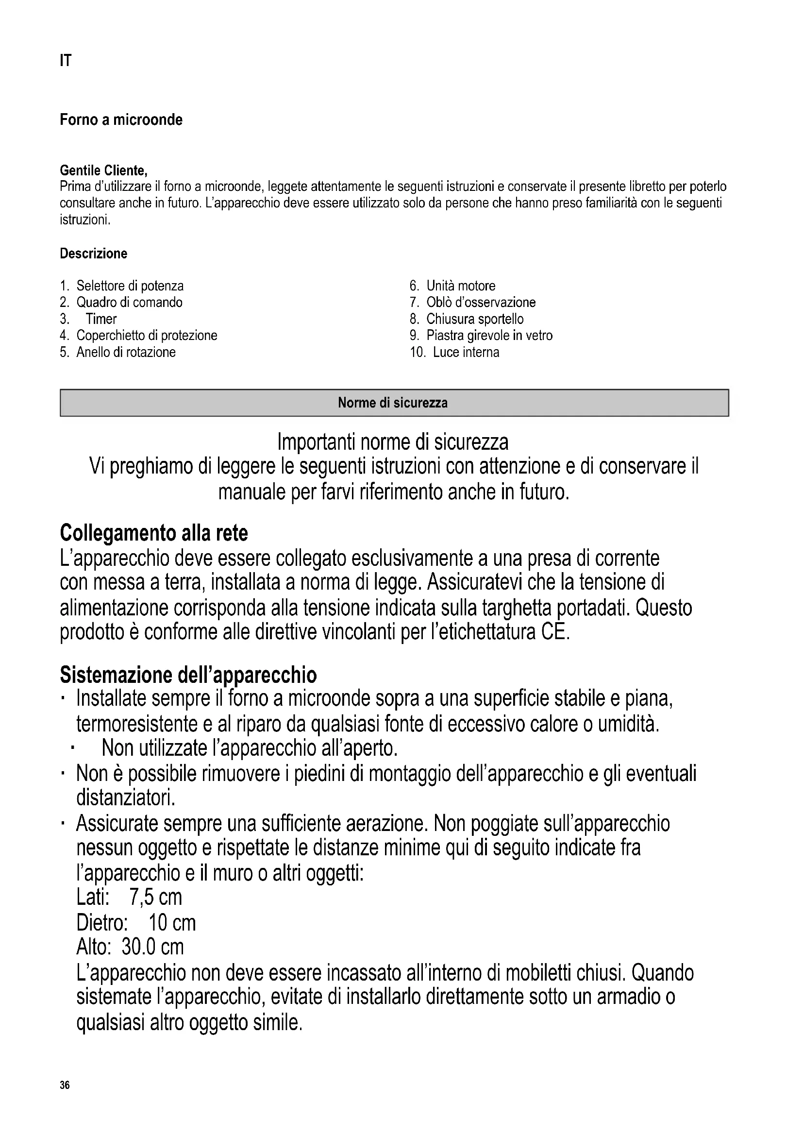 Norme di sicurezza Importanti norme di sicurezza Vi preghiamo di leggere le seguenti istruzioni con attenzione e di conservare il manuale per farvi riferimento anche in futuro. Collegamento alla rete L’apparecchio deve essere collegato esclusivamente a una presa di corrente con messa a terra, installata a norma di legge. Assicuratevi che la tensione di alimentazione corrisponda alla tensione indicata sulla targhetta portadati. Questo prodotto è conforme alle direttive vincolanti per l’etichettatura CE. Sistemazione dell’apparecchio ∙ Installate sempre il forno a microonde sopra a una supercie stabile e piana, termoresistente e al riparo da qualsiasi fonte di eccessivo calore o umidità. ∙ Non utilizzate l’apparecchio all’aperto. ∙ Non è possibile rimuovere i piedini di montaggio dell’apparecchio e gli eventuali distanziatori. ∙ Assicurate sempre una sufciente aerazione. Non poggiate sull’apparecchio nessun oggetto e rispettate le distanze minime qui di seguito indicate fra l’apparecchio e il muro o altri oggetti: Lati: 7,5 cm Dietro: 10 cm Alto: 30.0 cm L’apparecchio non deve essere incassato all’interno di mobiletti chiusi. Quando sistemate l’apparecchio, evitate di installarlo direttamente sotto un armadio o qualsiasi altro oggetto simile.37 142 x 208 mm Consigli utili ∙ Avvertenza: Alcuni alimenti possono prendere fuoco. Non lasciate l’apparecchio senza sorveglianza quando è in funzione. ∙ Questo forno a microonde è stato progettato esclusivamente per lo scongelamento, il riscaldamento e la cottura degli alimenti. Avvertenza: Ogni tentativo di riscaldare cibi secchi o capi di abbigliamento, cuscinetti scaldini, pantofole, spugne, stronacci bagnati ecc.: può essere causa di infortunio, fuoco o incendio. ∙ Nessuna responsabilità verrà assunta in caso di danni risultanti da un uso erroneo o dalla non conformità alle istruzioni. ∙ Utilizzate solo utensili da cucina adatti all’uso con le microonde. Durante il funzionamento a microonde non è possibile utilizzare contenitori in metallo per riscaldare cibi e bevande. Per maggiori informazioni, consultate la sezione “Utilizzate sempre utensili da cucina idonei”. ∙ L’apparecchio non è previsto per l’utilizzo con un timer esterno o con un sistema separato di comando a distanza. ∙ Il presente apparecchio può essere usato da bambini (di almeno 8 anni di età) e da persone con ridotte capacità siche, sensoriali o mentali, o da persone senza particolari esperienze o conoscenze, purché siano sotto sorveglianza o siano state date loro istruzioni sull’uso dell’apparecchio e comprendano pienamente i rischi e le precauzioni di sicurezza che l’apparecchio comporta. ∙ Ai bambini non deve essere consentito di giocare con l’apparecchio. ∙ Ai bambini non deve essere consentito di effettuare lavori di pulitura o di manutenzione dell’apparecchio senza la supervisione di un adulto. ∙ L’apparecchio e il cavo di alimentazione devono essere tenuti sempre fuori della portata di bambini di età inferiore agli 8 anni. ∙ Per evitare ogni rischio di scossa elettrica, non pulite l’apparecchio con acqua e non immergetelo in acqua. ∙ Non pulite l’apparecchio utilizzando delle idropulitrici. ∙ Spegnete sempre l’apparecchio e disinserite la spina dalla presa di corrente: - durante ogni pulizia, - in caso di cattivo funzionamento. - dopo ogni uso. ∙ Per disinserire la spina dalla presa di corrente, non tirate mai il cavo di alimentazione ma afferrate direttamente la spina. Non toccate la spina di alimentazione con le mani umide.