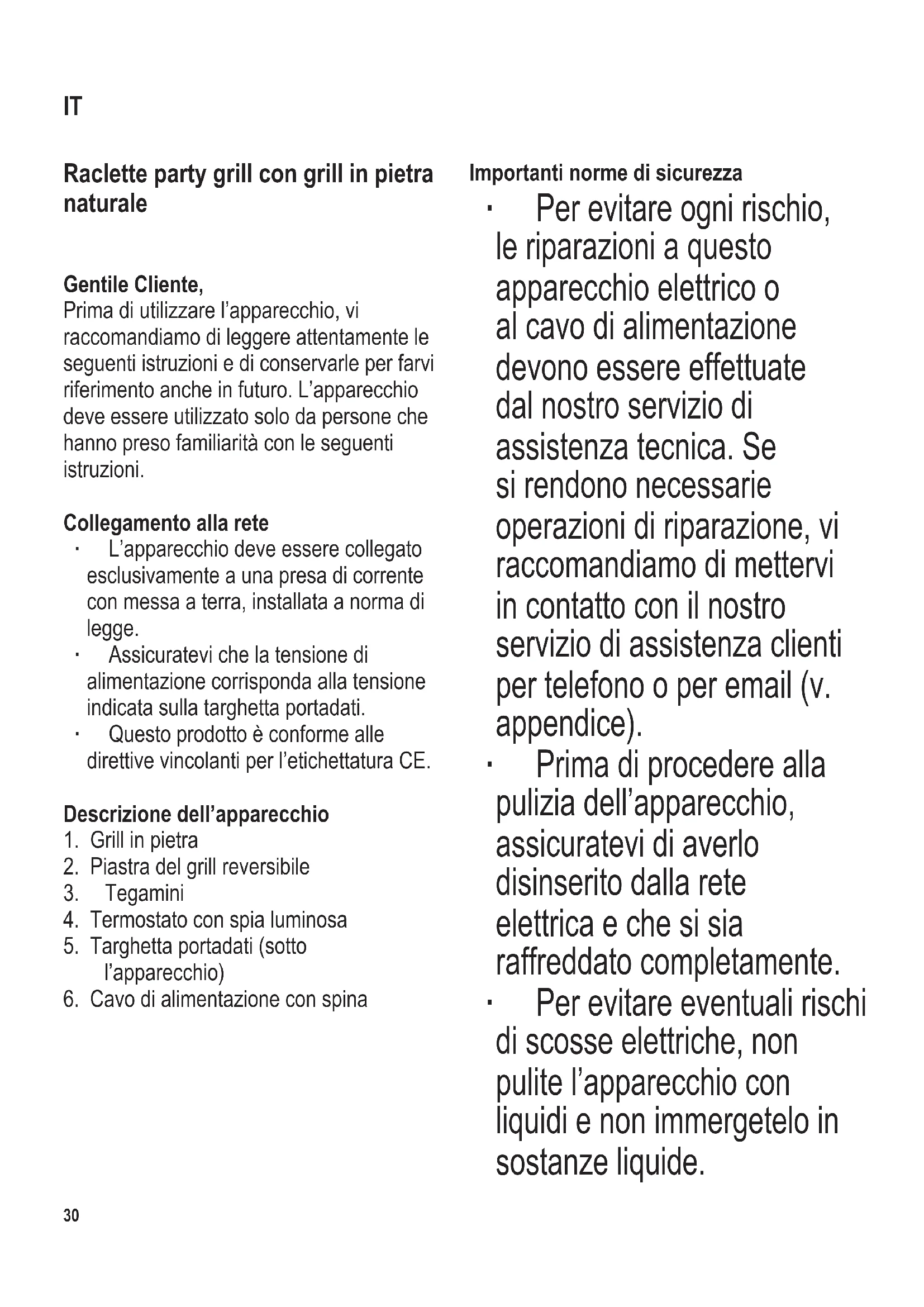 ∙ Disinserite sempre la spina dalla presa - dopo l’uso, - in caso di cattivo funzionamento, - prima di pulire l’apparecchio. ∙ Per disinserire la spina dalla presa di corrente, non tirate mai il cavo di alimentazione, ma afferrate direttamente la spina. ∙ Nessuna responsabilità verrà assunta in caso di danni risultanti da un uso errato o dalla non conformità alle istruzioni. Funzionalità Questo apparecchio è un grill elettrico per raclette, adatto per grigliare carni magre, pesci e ortaggi e per preparare formaggi “au gratin”. Ogni altro utilizzo diverso da quello descritto in questo manuale è da considerarsi improprio e può portare a lesioni personali o a danni materiali. Primo utilizzo ∙ Eliminate completamente tutto il materiale di imballaggio. ∙ Prima di mettere in uso il grill per la prima volta, pulite la piastra del grill reversibile, il grill in pietra e i tegamini con un panno umido. ∙ Fate preriscaldare l’apparecchio con la pietra / piastra e i tegamini per circa 10 minuti senza aggiungere alimenti: questo accorgimento servirà ad eliminare il cattivo odore tipico emesso da un grill alla sua prima messa in funzione. È possibile che si diffonda un po’ di fumo. È bene quindi assicurare una buona aerazione lasciando aperte porte e nestre. ∙ In seguito pulite l’apparecchio seguendo le istruzioni indicate nella sezione Manutenzione e pulizia. Grill in pietra ∙ Prima di ogni utilizzo, inserite sull’apparecchio la pietra con il lato liscio rivolto verso l’alto, vicino alla piastra reversibile di grigliatura, accertandovi che gli angoli arrotondati siano rivolti verso l’esterno. Avvertenza: Evitate di mettere la pietra fredda sull’elemento riscaldante già caldo. ∙ La pietra può essere usata per preparare ortaggi, fettine di carne, letti di pesce e altro. ∙ La pietra è un materiale assolutamente naturale. È possibile che presenti piccole incrinature causate dalla normale espansione e contrazione del materiale durante le fasi di riscaldamento e di raffreddamento o che acquisti una colorazione più scura: ciò è del tutto normale e non comporta nessun effetto dannoso. ∙ Non mettete mai sulla pietra alimenti congelati o che contengono aceto (p. es. cetriolini sottaceto o senape). Piastra di grigliatura reversibile ∙ Prima di ogni utilizzo, inserite sull’apparecchio la piastra di grigliatura reversibile vicino alla pietra, accertandovi che gli angoli arrotondati siano rivolti verso l’esterno. ∙ Con il lato a nervature rivolto verso l’alto, la piastra del grill può essere usata per grigliare carne, salsicce e34 104 x 142 mm altro. Il lato liscio è ideale per pesci e ortaggi. Ungete leggermente la piastra di grigliatura prima dell’uso. Termostato variabile e spia luminosa ∙ Il termostato serve a regolare la temperatura tra il valore di MIN e quello di MAX. ∙ La spia luminosa mostra la fase di riscaldamento corrente: Riscaldamento attivato = spia luminosa accesa Riscaldamento disattivato = spia luminosa spenta ∙ Dopo l’uso, riportate il termostato sull’impostazione più bassa e scollegate l’apparecchio dall’alimentazione elettrica. Funzionamento Consiglio: Per apprezzare al massimo una grigliata, consigliamo di togliere la carne dal frigorifero circa 30 minuti prima di grigliare e di lasciarla riposare in un piatto coperto. ∙ Sistemate la pietra di grigliatura e la piastra reversibile sull’apparecchio. ∙ Collegate la spina a una presa di corrente elettrica adatta e ruotate il termostato tutto verso destra. ∙ Lasciate che l’apparecchio si riscaldi 10 minuti circa perché raggiunga la temperatura necessaria. Ma l’utilizzo del grill in pietra, richiede un tempo di pre-riscaldamento di circa 25 minuti. ∙ Sistemate gli alimenti sulla piastra del grill o sulla pietra. ∙ Sistemate il formaggio raclette nei tegamini. Mettete i tegamini nell’apparecchio, sotto l’elemento riscaldante e lasciateli no a quando il formaggio si è sciolto. ∙ Avvertenza: Non mettete i tegamini vuoti nell’apparecchio acceso. ∙ Dopo l’uso, ruotate il termostato tutto verso sinistra e scollegate l’apparecchio dall’alimentazione elettrica. Preparazione del formaggio raclette Calcolate 200-300 grammi di formaggio a persona. Tagliate il formaggio in fette da 3-5 millimetri di spessore e sistemate le fette sui tegamini. Vi consigliamo di utilizzare il formaggio raclette originale, anche se può essere utilizzato qualsiasi altro formaggio che fonde facilmente. Consigli pratici ∙ Fate scongelare perfettamente gli alimenti congelati prima di cucinarli. ∙ Evitate di danneggiare il rivestimento antiaderente della piastra del grill reversibile e dei tegamini utilizzando utensili antigrafo. ∙ Se desiderate preparare una grande quantità di cibo, ricordatevi che ogni tanto dovrete rimuovere con attenzione il grasso accumulato; utilizzate un panno da cucina adatto o altro materiale simile.104 x 142 mm