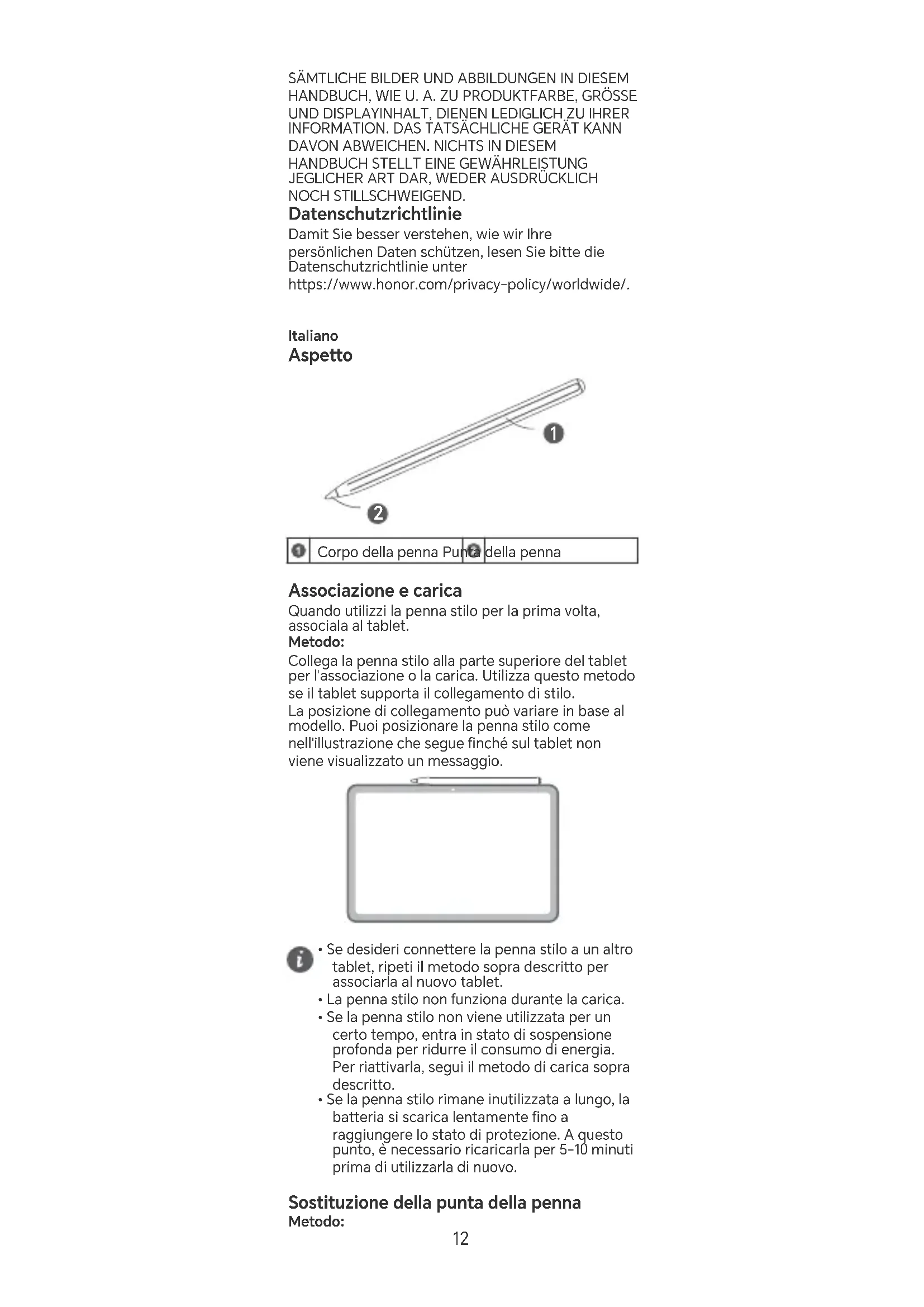 Corpo della penna Punta della penna Associazione e carica Quando utilizzi la penna stilo per la prima volta, associala al tablet. Metodo: Collega la penna stilo alla pae superiore del tablet per l'associazione o la carica. Utilizza questo metodo se il tablet suppoa il collegamento di stilo. La posizione di collegamento può variare in base al modello. Puoi posizionare la penna stilo come nell'illustrazione che segue nché sul tablet non viene visualizzato un messaggio.