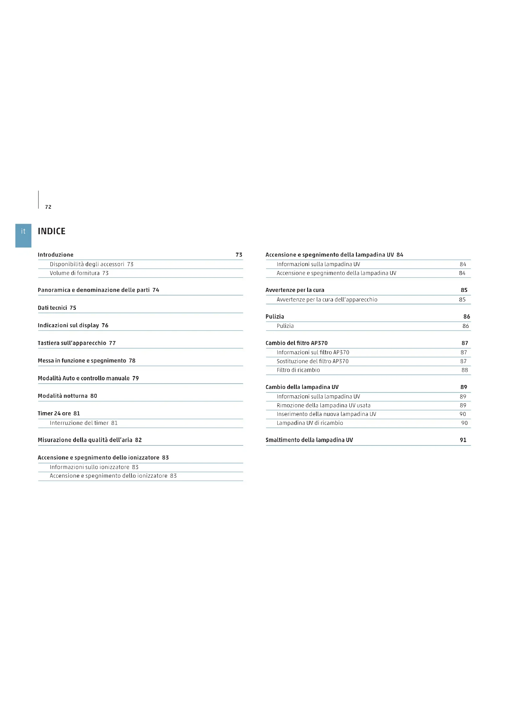 INDICE Introduzione 73 Disponibilità degli accessori 73 Volume di fornitura 73 Panoramica e denominazione delle parti 74 Dati tecnici 75 Indicazioni sul display 76 Tastiera sull’apparecchio 77 Messa in funzione e spegnimento 78 Modalità Auto e controllo manuale 79 Modalità notturna 80 Timer 24 ore 81 Interruzione del timer 81 Misurazione della qualità dell’aria 82 Accensione e spegnimento dello ionizzatore 83 Informazioni sullo ionizzatore 83 Accensione e spegnimento dello ionizzatore 83 Accensione e spegnimento della lampadina UV 84 Informazioni sulla lampadina UV 84 Accensione e spegnimento della lampadina UV 84 Avvertenze per la cura 85 Avvertenze per la cura dell’apparecchio 85 Pulizia 86 Pulizia 86 Cambio del filtro AP370 87 Informazioni sul filtro AP370 87 Sostituzione del filtro AP370 87 Filtro di ricambio 88 Cambio della lampadina UV 89 Informazioni sulla lampadina UV 89 Rimozione della lampadina UV usata 89 Inserimento della nuova lampadina UV 90 Lampadina UV di ricambio 90 Smaltimento della lampadina UV 9173