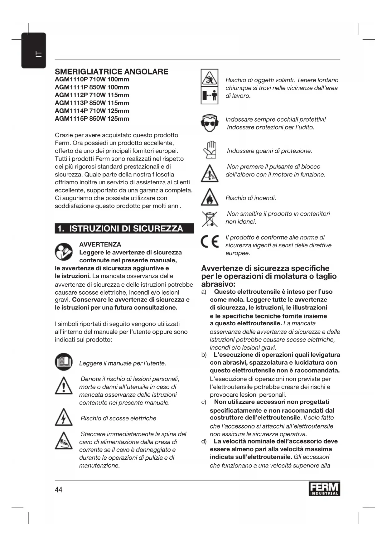 SMERIGLIATRICE ANGOLARE AGM1110P 710W 100mm AGM1111P 850W 100mm AGM1112P 710W 115mm AGM1113P 850W 115mm AGM1114P 710W 125mm AGM1115P 850W 125mm Grazie per avere acquistato questo prodotto Ferm. Ora possiedi un prodotto eccellente, offerto da uno dei principali fornitori europei. Tutti i prodotti Ferm sono realizzati nel rispetto dei più rigorosi standard prestazionali e di sicurezza. Quale parte della nostra filosofia offriamo inoltre un servizio di assistenza ai clienti eccellente, supportato da una garanzia completa. Ci auguriamo che possiate utilizzare con soddisfazione questo prodotto per molti anni.