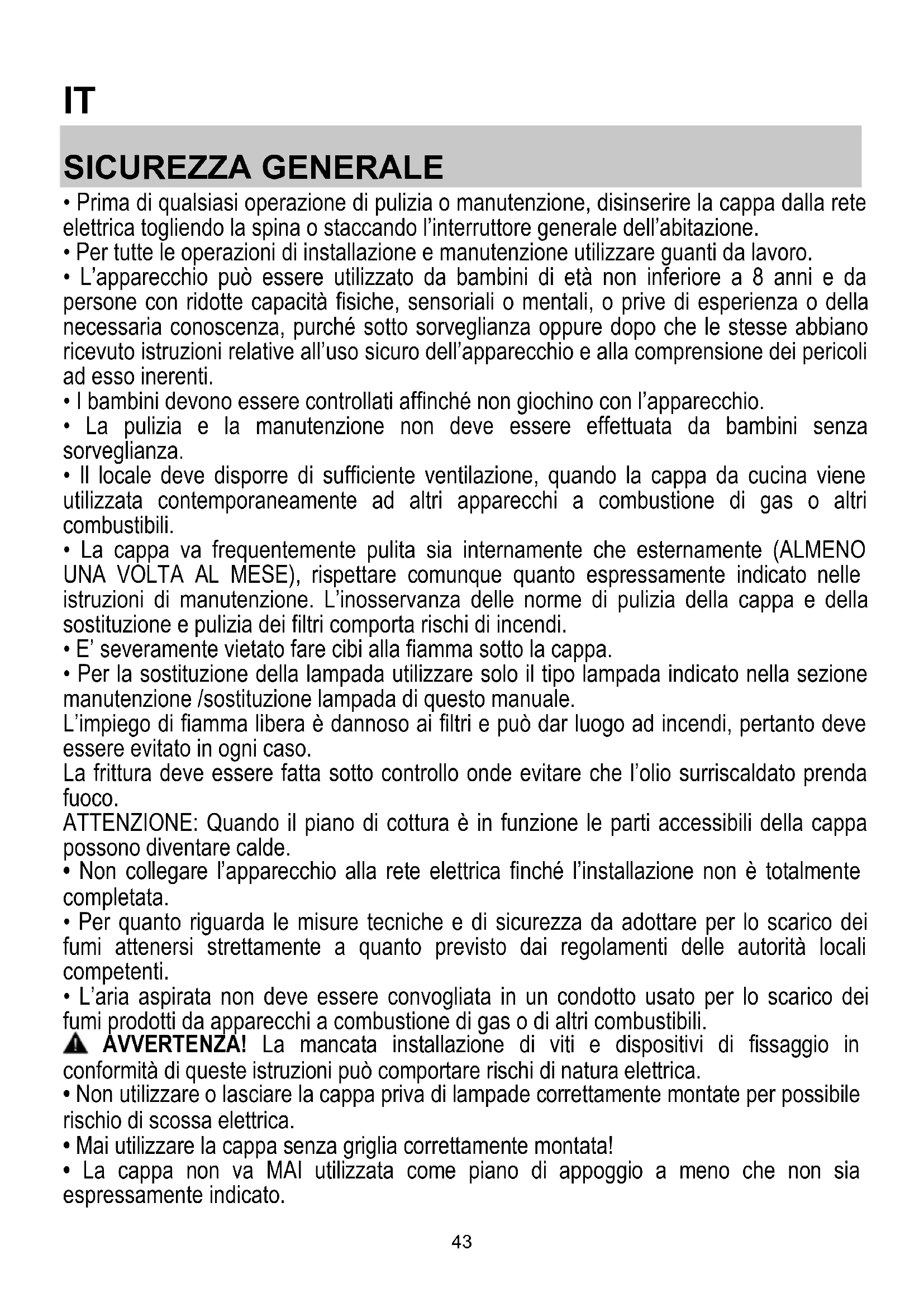 - Non utilizzare o lasciare la cappa priva di lampade correttamente montate per possibile rischio di scossa elettrica.
