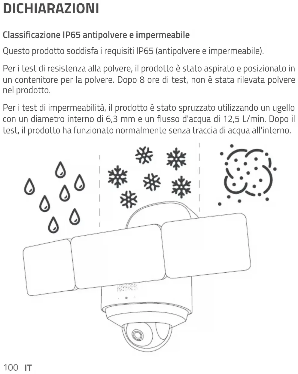 DICHIARAZIONI Classificazione IP65 antipolvere e impermeabile Questo prodotto soddisfa i requisiti IP65 (antipolvere e impermeabile). Per i test di resistenza alla polvere, il prodotto è stato aspirato e posizionato in un contenitore per la polvere. Dopo 8 ore di test, non è stata rilevata polvere nel prodotto. Per i test di impermeabilità, il prodotto è stato spruzzato utilizzando un ugello con un diametro interno di 6,3 mm e un flusso d'acqua di 12,5 L/min. Dopo il test, il prodotto ha funzionato normalmente senza traccia di acqua all'interno.IT