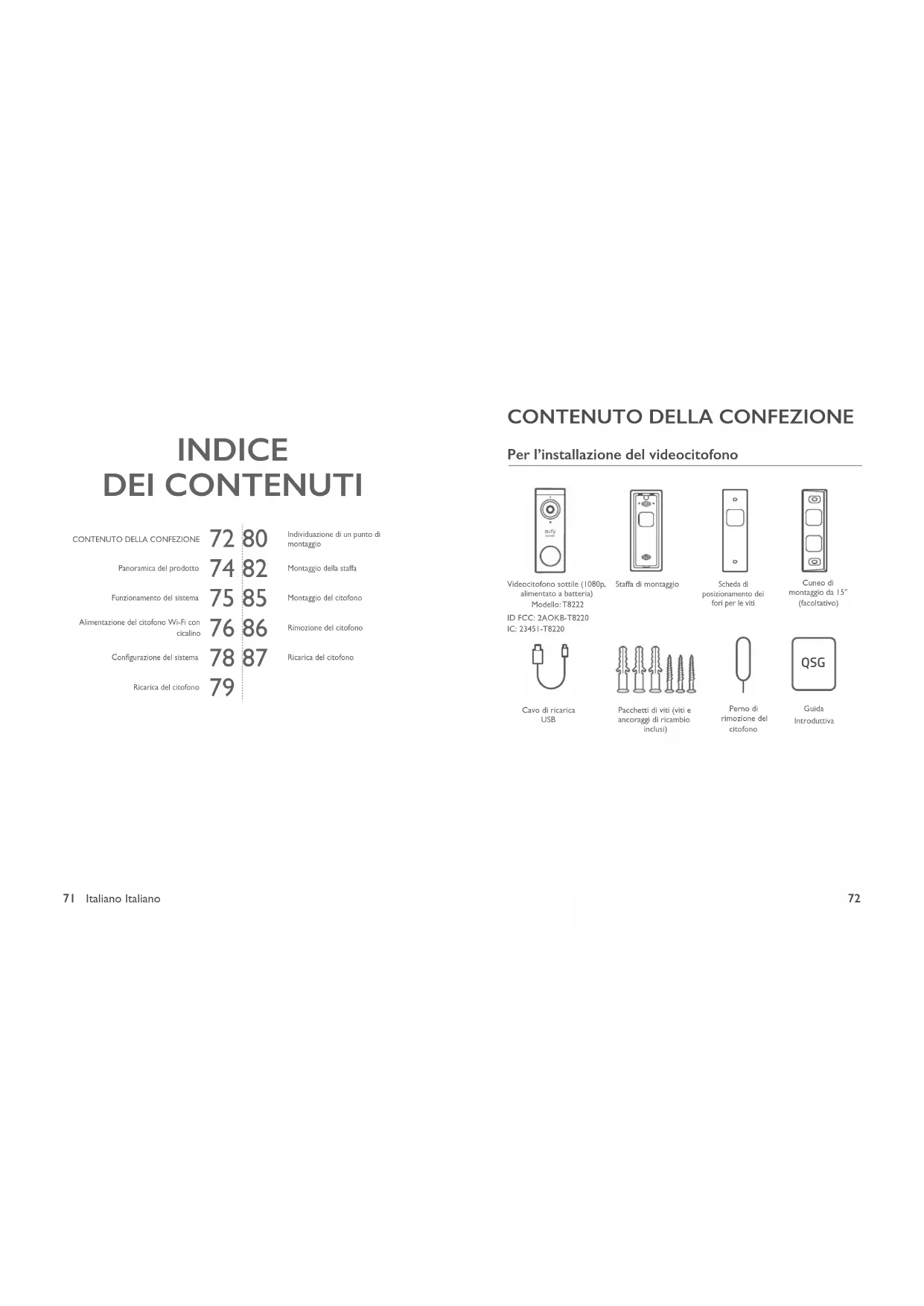 Per l’installazione del videocitofono QSG Videocitofono sottile (1080p, alimentato a batteria) Modello: T8222Pacchetti di viti (viti e ancoraggi di ricambio inclusi)Guida IntroduttivaScheda di posizionamento dei fori per le vitiPerno di rimozione del citofonoCuneo di montaggio da 15° (facoltativo)Staffa di montaggioID FCC: 2AOKB-T8220IC: 23451-T8220Cavo di ricarica USB73 Italiano Italiano