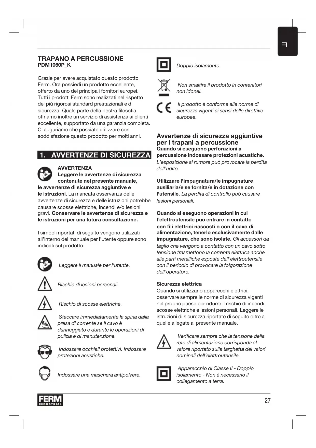 AVVERTENZA Leggere le avvertenze di sicurezza contenute nel presente manuale, le avvertenze di sicurezza aggiuntive e le istruzioni. La mancata osservanza delle avvertenze di sicurezza e delle istruzioni potrebbe causare scosse elettriche, incendi e/o lesioni gravi. Conservare le avvertenze di sicurezza e le istruzioni per una futura consultazione. I simboli riportati di seguito vengono utilizzati all’interno del manuale per l’utente oppure sono indicati sul prodotto: Leggere il manuale per l’utente. Rischio di lesioni personali. Rischio di scosse elettriche. Staccare immediatamente la spina dalla presa di corrente se il cavo è danneggiato e durante le operazioni di pulizia e di manutenzione. Indossare occhiali protettivi. Indossare protezioni acustiche. Indossare una maschera antipolvere. Doppio isolamento. Non smaltire il prodotto in contenitori non idonei. Il prodotto è conforme alle norme di sicurezza vigenti ai sensi delle direttive europee. Avvertenze di sicurezza aggiuntive per i trapani a percussione Quando si eseguono perforazioni a percussione indossare protezioni acustiche. L’esposizione al rumore può provocare la perdita dell’udito. Utilizzare l’impugnatura/le impugnature ausiliaria/e se fornita/e in dotazione con l’utensile. La perdita di controllo può causare lesioni personali. Quando si eseguono operazioni in cui l’elettroutensile può entrare in contatto con li elettrici nascosti o con il cavo di alimentazione, tenerlo esclusivamente dalle impugnature, che sono isolate. Gli accessori da taglio che vengono a contatto con un cavo sotto tensione trasmettono la corrente elettrica anche alle parti metalliche esposte dell’elettroutensile con il pericolo di provocare la folgorazione dell’operatore. Sicurezza elettrica Quando si utilizzano apparecchi elettrici, osservare sempre le norme di sicurezza vigenti nel proprio paese per ridurre il rischio di incendi, scosse elettriche e lesioni personali. Leggere le istruzioni di sicurezza riportate di seguito oltre a quelle allegate al presente manuale. Verificare sempre che la tensione della rete di alimentazione corrisponda al valore riportato sulla targhetta dei valori nominali dell’elettroutensile. Apparecchio di Classe II - Doppio isolamento - Non è necessario il collegamento a terra.28