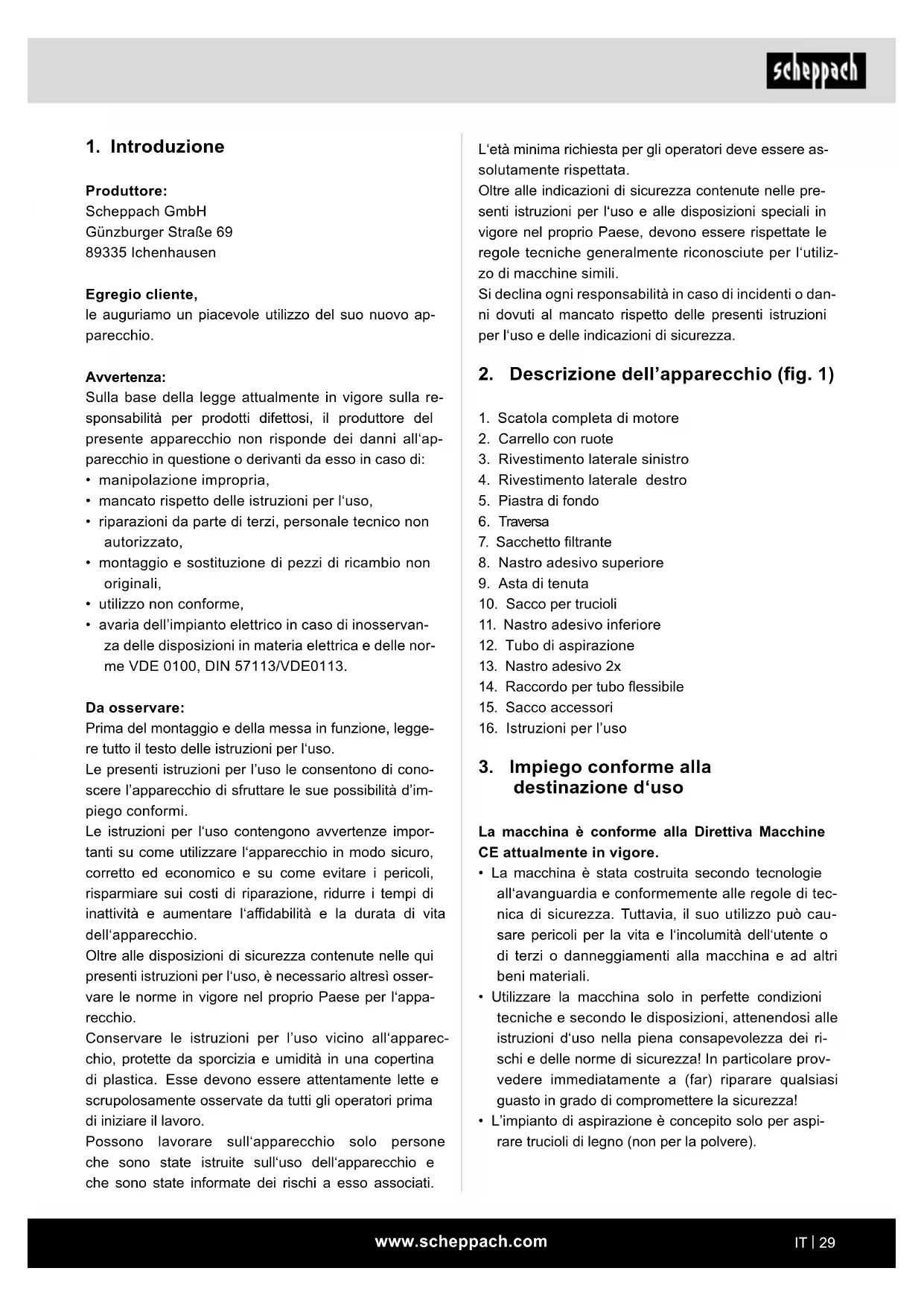 Produttore: Scheppach GmbH Günzburger Straße 69 89335 Ichenhausen Egregio cliente, le auguriamo un piacevole utilizzo del suo nuovo ap- parecchio. Avvertenza: Sulla base della legge attualmente in vigore sulla re- sponsabilità per prodotti difettosi, il produttore del presente apparecchio non risponde dei danni all‘ap- parecchio in questione o derivanti da esso in caso di: