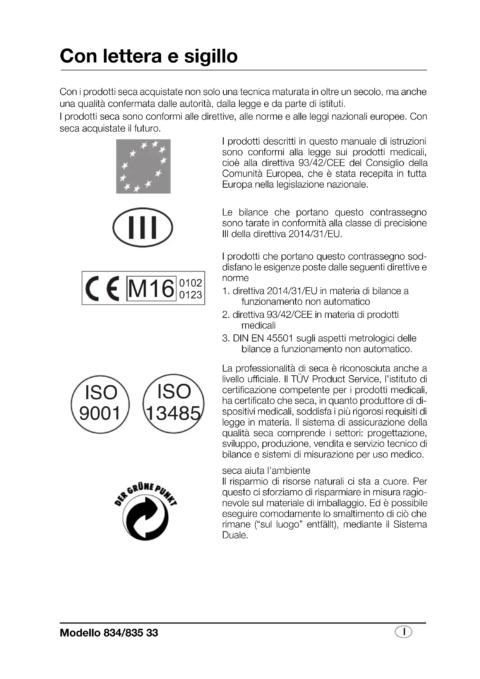 Con lettera e sigillo Con i prodotti seca acquistate non solo una tecnica maturata in oltre un secolo, ma anche una qualità confermata dalle autorità, dalla legge e da parte di istituti. I prodotti seca sono conformi alle direttive, alle norme e alle leggi nazionali europee. Con seca acquistate il futuro.I prodotti descritti in questo manuale di istruzioni sono conformi alla legge sui prodotti medicali, cioè alla direttiva 93/42/CEE del Consiglio della Comunità Europea, che è stata recepita in tutta Europa nella legislazione nazionale.Le bilance che portano questo contrassegno sono tarate in conformità alla classe di precisione III della direttiva 2014/31/EU. I prodotti che portano questo contrassegno sod-disfano le esigenze poste dalle seguenti direttive e norme 1. direttiva 2014/31/EU in materia di bilance a funzionamento non automatico2. direttiva 93/42/CEE in materia di prodotti medicali 3. DIN EN 45501 sugli aspetti metrologici delle bilance a funzionamento non automatico.La professionalità di seca è riconosciuta anche a livello ufficiale. Il TÜV Product Service, l’istituto di certificazione competente per i prodotti medicali, ha certificato che seca, in quanto produttore di di-spositivi medicali, soddisfa i più rigorosi requisiti di legge in materia. Il sistema di assicurazione della qualità seca comprende i settori: progettazione, sviluppo, produzione, vendita e servizio tecnico di bilance e sistemi di misurazione per uso medico.seca aiuta l’ambiente Il risparmio di risorse naturali ci sta a cuore. Per questo ci sforziamo di risparmiare in misura ragio-nevole sul materiale di imballaggio. Ed è possibile eseguire comodamente lo smaltimento di ciò che rimane (“sul luogo” entfällt), mediante il Sistema Duale.