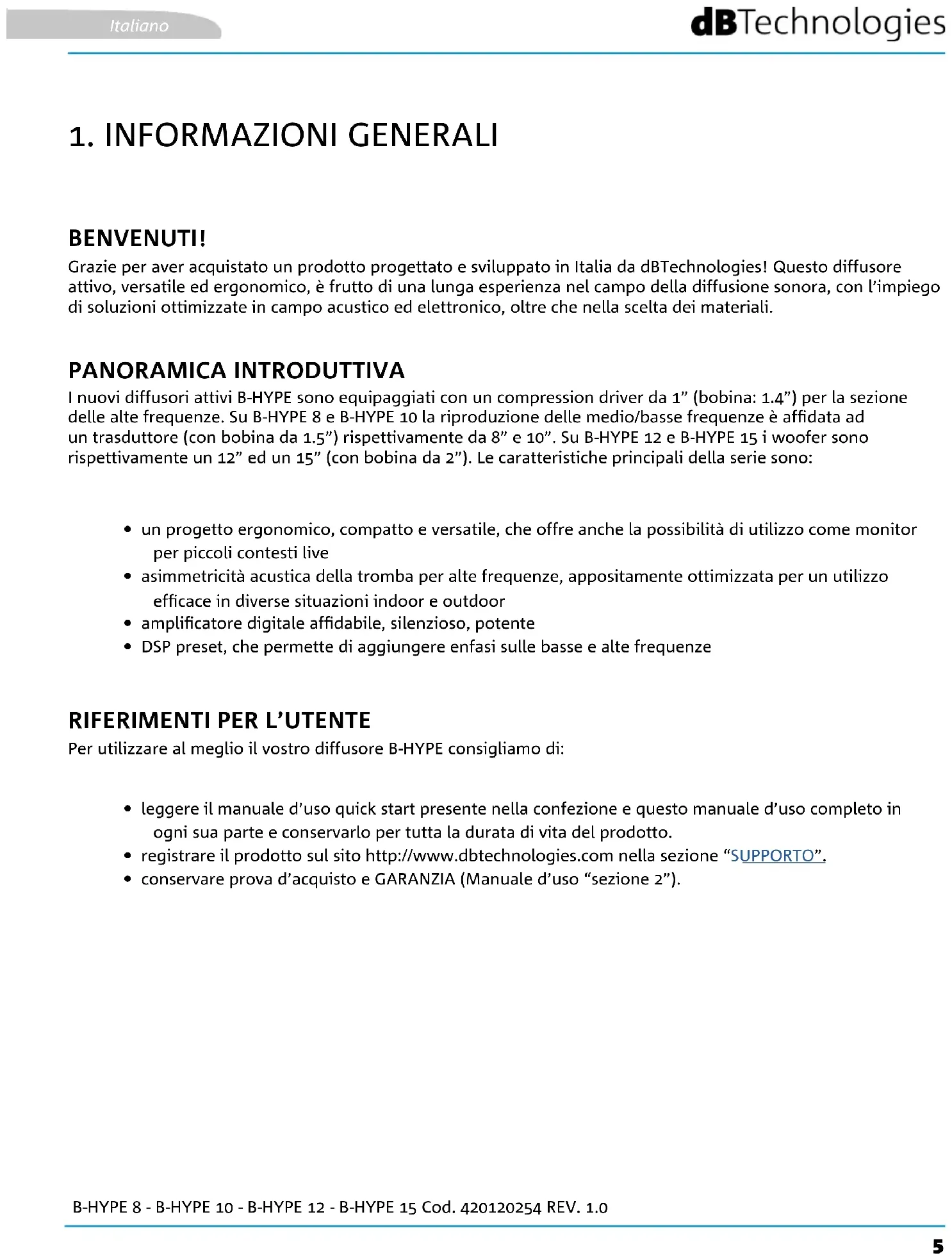 Grazie per aver acquistato un prodotto progettato e sviluppato in Italia da dBTechnologies! Questo diffusore attivo, versatile ed ergonomico, è frutto di una lunga esperienza nel campo della diffusione sonora, con l’impiego di soluzioni ottimizzate in campo acustico ed elettronico, oltre che nella scelta dei materiali. I nuovi diffusori attivi B-HYPE sono equipaggiati con un compression driver da 1” (bobina: 1.4”) per la sezione delle alte frequenze. Su B-HYPE 8 e B-HYPE 10 la riproduzione delle medio/basse frequenze è afdata ad un trasduttore (con bobina da 1.5”) rispettivamente da 8” e 10”. Su B-HYPE 12 e B-HYPE 15 i woofer sono rispettivamente un 12” ed un 15” (con bobina da 2”). Le caratteristiche principali della serie sono: Per utilizzare al meglio il vostro diffusore B-HYPE consigliamo di: