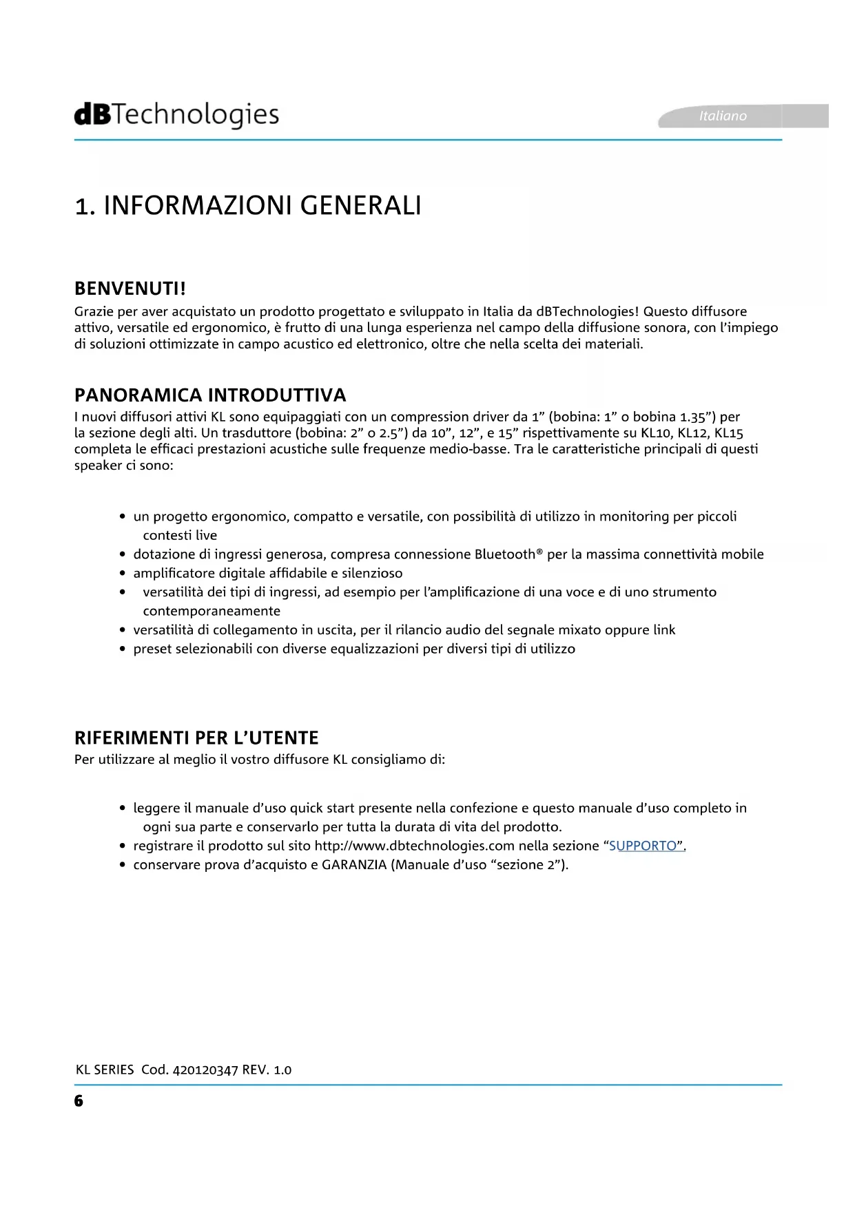 Grazie per aver acquistato un prodotto progettato e sviluppato in Italia da dBTechnologies! Questo diffusore attivo, versatile ed ergonomico, è frutto di una lunga esperienza nel campo della diffusione sonora, con l’impiego di soluzioni ottimizzate in campo acustico ed elettronico, oltre che nella scelta dei materiali. I nuovi diffusori attivi KL sono equipaggiati con un compression driver da 1” (bobina: 1” o bobina 1.35”) per la sezione degli alti. Un trasduttore (bobina: 2” o 2.5”) da 10”, 12”, e 15” rispettivamente su KL10, KL12, KL15 completa le efcaci prestazioni acustiche sulle frequenze medio-basse. Tra le caratteristiche principali di questi speaker ci sono: Per utilizzare al meglio il vostro diffusore KL consigliamo di: