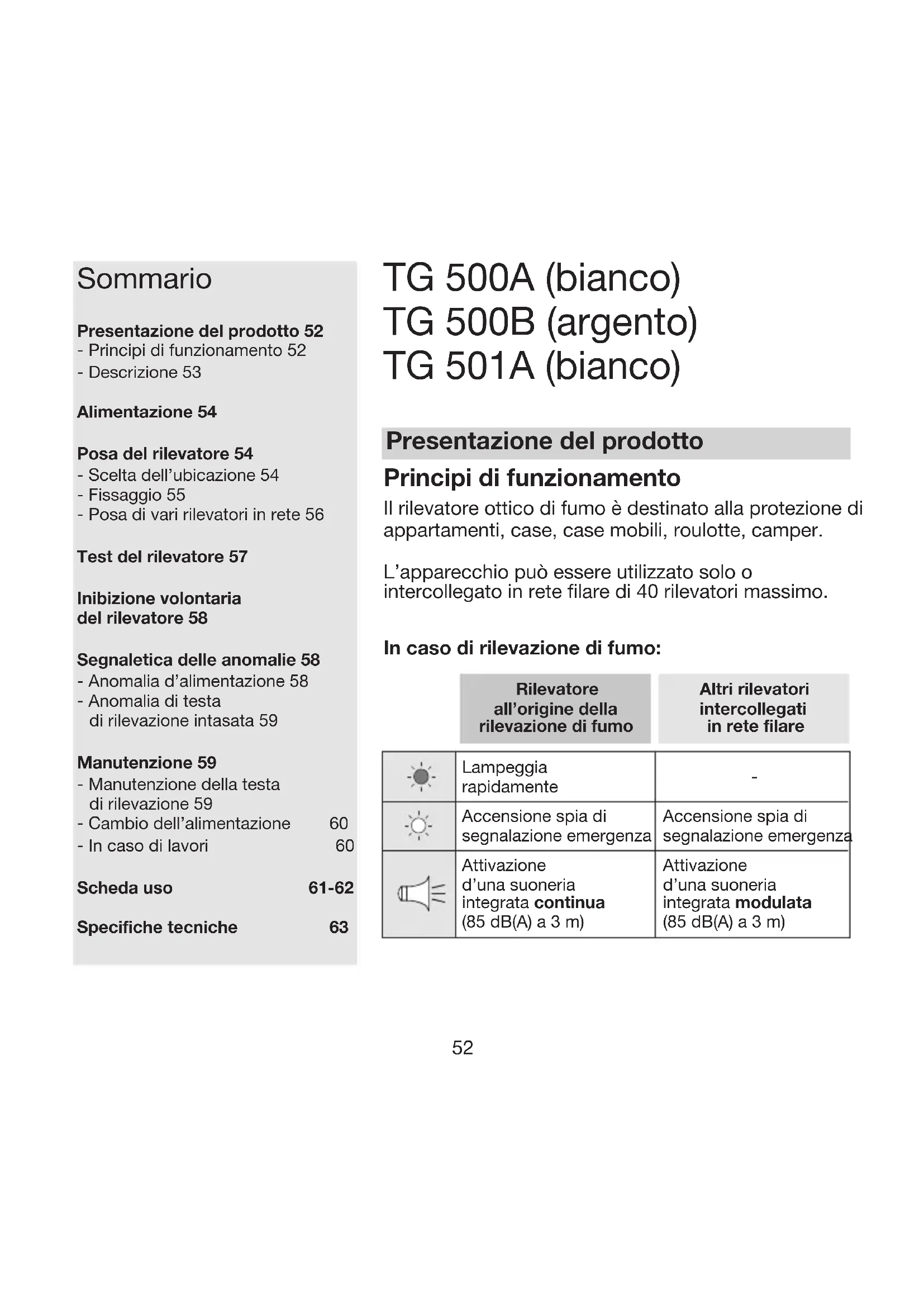 Sommario Presentazione del prodotto 52 - Principi di funzionamento 52 - Descrizione 53 Alimentazione 54 Posa del rilevatore 54 - Scelta dell’ubicazione 54 - Fissaggio 55 - Posa di vari rilevatori in rete 56 Test del rilevatore 57 Inibizione volontaria del rilevatore 58 Segnaletica delle anomalie 58 - Anomalia d’alimentazione 58 - Anomalia di testa di rilevazione intasata 59 Manutenzione 59 - Manutenzione della testa di rilevazione 59 - Cambio dell’alimentazione 60 - In caso di lavori 60 Scheda uso 61-62 Specifiche tecniche 63 TG 500A (bianco) TG 500B (argento) TG 501A (bianco) Principi di funzionamento Il rilevatore ottico di fumo è destinato alla protezione di appartamenti, case, case mobili, roulotte, camper. L’apparecchio può essere utilizzato solo o intercollegato in rete filare di 40 rilevatori massimo. In caso di rilevazione di fumo: Presentazione del prodotto53 Morsettiera di connessione Connettore batteria