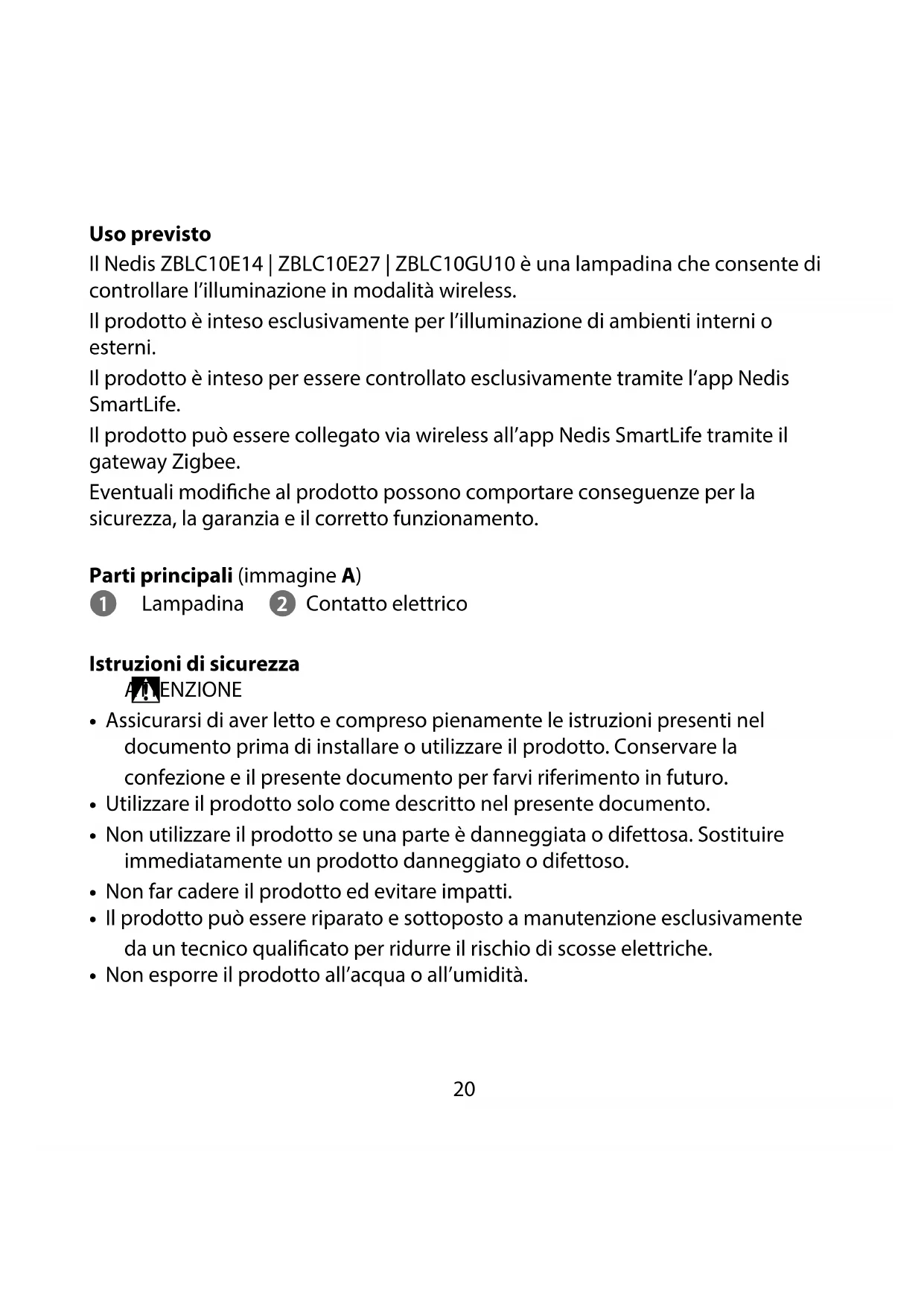 Per maggiori informazioni vedere il manuale esteso online: ned.is/zblc10e14 | ned.is/zblc10e27 | ned.is/zblc10gu1020 Uso previsto Il Nedis ZBLC10E14 | ZBLC10E27 | ZBLC10GU10 è una lampadina che consente di controllare l’illuminazione in modalità wireless. Il prodotto è inteso esclusivamente per l’illuminazione di ambienti interni o esterni. Il prodotto è inteso per essere controllato esclusivamente tramite l’app Nedis SmartLife. Il prodotto può essere collegato via wireless all’app Nedis SmartLife tramite il gateway Zigbee. Eventuali modiche al prodotto possono comportare conseguenze per la sicurezza, la garanzia e il corretto funzionamento. Parti principali (immagine A) 1 Lampadina 2 Contatto elettrico Istruzioni di sicurezza