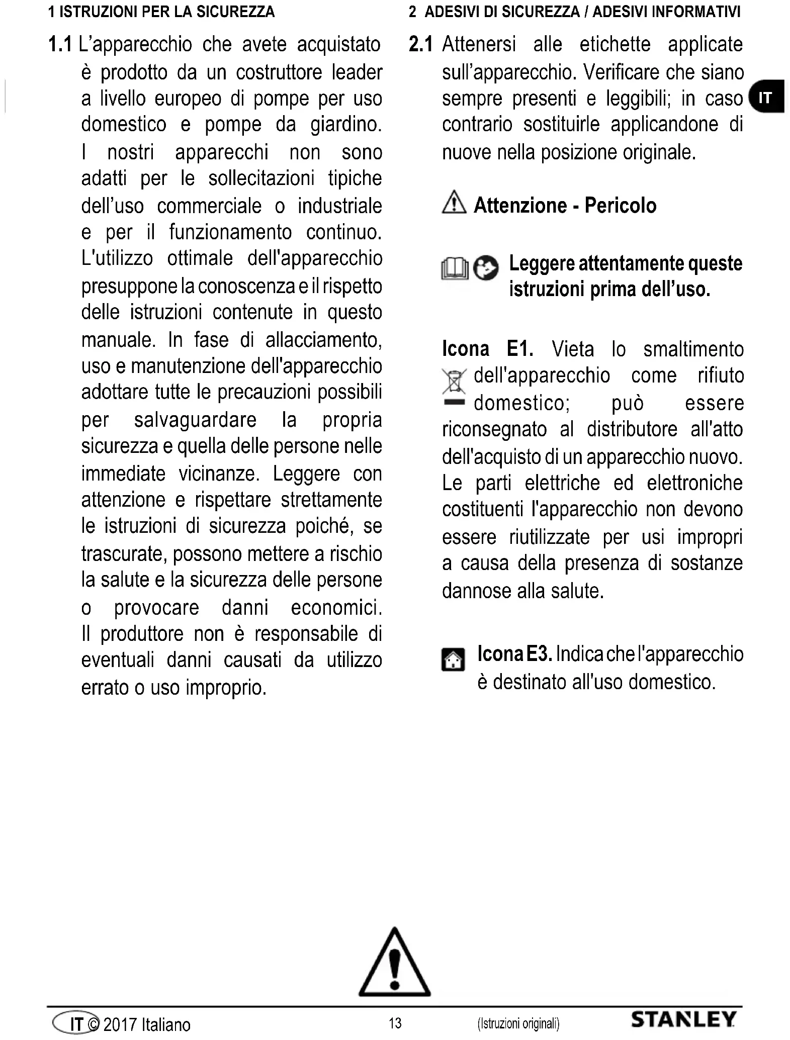 Attenersi alle etichette applicate sull’apparecchio. Verificare che siano sempre presenti e leggibili; in caso contrario sostituirle applicandone di nuove nella posizione originale. Attenzione - Pericolo Leggere attentamente queste istruzioni prima dell’uso. Icona E1. Vieta lo smaltimento dell'apparecchio come rifiuto domestico; può essere riconsegnato al distributore all'atto dell'acquisto di un apparecchio nuovo. Le parti elettriche ed elettroniche costituenti l'apparecchio non devono essere riutilizzate per usi impropri a causa della presenza di sostanze dannose alla salute. Icona E3. Indica che l'apparecchio è destinato all'uso domestico.14 (Istruzioni originali) IT © 2017 Italiano