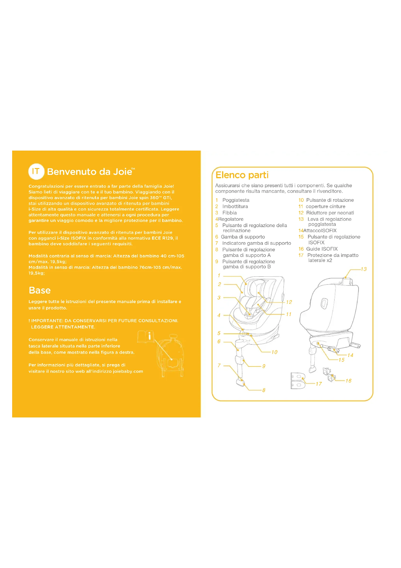 Congratulazioni per essere entrato a far parte della famiglia Joie! Siamo lieti di viaggiare con te e il tuo bambino. Viaggiando con il dispositivo avanzato di ritenuta per bambini Joie spin 360™ GTi, stai utilizzando un dispositivo avanzato di ritenuta per bambini i-Size di alta qualità e con sicurezza totalmente certificata. Leggere attentamente questo manuale e attenersi a ogni procedura per garantire un viaggio comodo e la migliore protezione per il bambino.Per utilizzare il dispositivo avanzato di ritenuta per bambini Joie con agganci i-Size ISOFIX in conformità alla normativa ECE R129, il bambino deve soddisfare i seguenti requisiti.Modalità contraria al senso di marcia: Altezza del bambino 40 cm-105 cm/max. 19,5kg;Modalità in senso di marcia: Altezza del bambino 76cm-105 cm/max. 19,5kg; Base Leggere tutte le istruzioni del presente manuale prima di installare e usare il prodotto.! IMPORTANTE: DA CONSERVARSI PER FUTURE CONSULTAZIONI.LEGGERE ATTENTAMENTE.Conservare il manuale di istruzioni nella tasca laterale situata nella parte inferiore della base, come mostrato nella figura a destra.Per informazioni più dettagliate, si prega di visitare il nostro sito web all'indirizzo joiebaby.com Elenco parti 1 Poggiatesta2 Imbottitura3 Fibbia4 Regolatore5 Pulsante di regolazione della reclinazione6 Gamba di supporto7 Indicatore gamba di supporto8 Pulsante di regolazione gamba di supporto A9 Pulsante di regolazione gamba di supporto B10 Pulsante di rotazione11 coperture cinture12 Riduttore per neonati 13 Leva di regolazione poggiatesta14 Attacco ISOFIX15 Pulsante di regolazione ISOFIX16 Guide ISOFIX17 Protezione da impatto laterale x2Assicurarsi che siano presenti tutti i componenti. Se qualche componente risulta mancante, consultare il rivenditore.