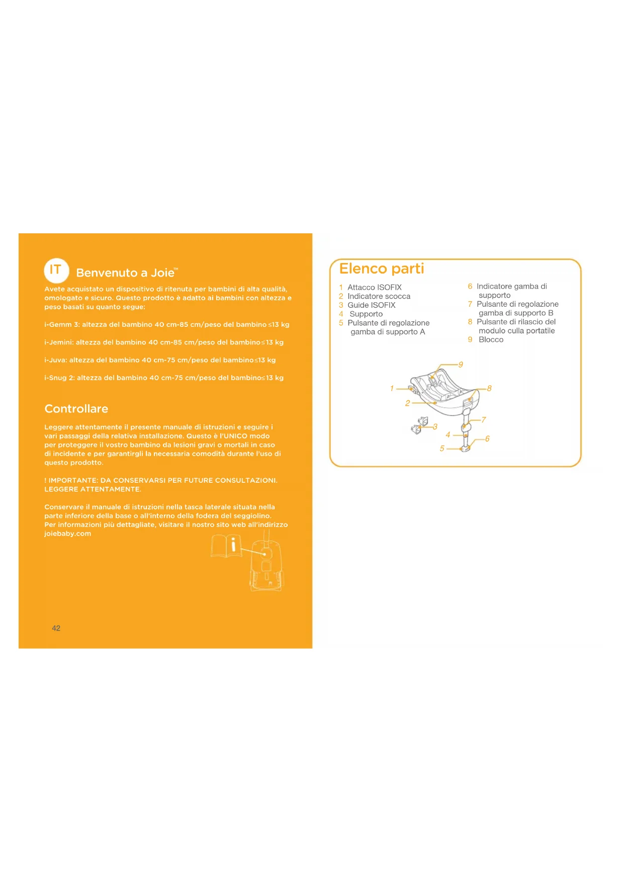 Avete acquistato un dispositivo di ritenuta per bambini di alta qualità, omologato e sicuro. Questo prodotto è adatto ai bambini con altezza e peso basati su quanto segue:i-Gemm 3: altezza del bambino 40 cm-85 cm/peso del bambino 13 kgi-Jemini: altezza del bambino 40 cm-85 cm/peso del bambino 13 kgi-Juva: altezza del bambino 40 cm-75 cm/peso del bambino 13 kgi-Snug 2: altezza del bambino 40 cm-75 cm/peso del bambino 13 kg Controllare Leggere attentamente il presente manuale di istruzioni e seguire i vari passaggi della relativa installazione. Questo è l’UNICO modo per proteggere il vostro bambino da lesioni gravi o mortali in caso di incidente e per garantirgli la necessaria comodità durante l’uso di questo prodotto.! IMPORTANTE: DA CONSERVARSI PER FUTURE CONSULTAZIONI. LEGGERE ATTENTAMENTE.Conservare il manuale di istruzioni nella tasca laterale situata nella parte inferiore della base o all’interno della fodera del seggiolino.Per informazioni più dettagliate, visitare il nostro sito web all'indirizzo joiebaby.com 6 Indicatore gamba di supporto 7 Pulsante di regolazione gamba di supporto B 8 Pulsante di rilascio del modulo culla portatile 9 Blocco