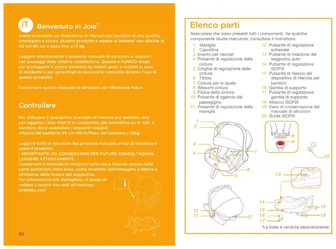 Avete acquistato un dispositivo di ritenuta per bambini di alta qualità﹐ omologato e sicuro. Questo prodotto è adatto ai bambini con altezza di 40 cm-85 cm e peso fino a 13 kg.Leggere attentamente il presente manuale di istruzioni e seguire i vari passaggi della relativa installazione. Questo è l’UNICO modo per proteggere il vostro bambino da lesioni gravi o mortali in caso di incidente e per garantirgli la necessaria comodità durante l’uso di questo prodotto.Conservare questo manuale di istruzioni per riferimenti futuri. Controllare Per utilizzare il dispositivo avanzato di ritenuta per bambini Joie con agganci i-Size ISOFIX in conformità alla normativa Un N. 129﹐ il bambino deve soddisfare i seguenti requisiti.Altezza del bambino 40 cm-85cm/Peso del bambino 13kg:Leggere tutte le istruzioni del presente manuale prima di installare e usare il prodotto.! IMPORTANTE: DA CONSERVARSI PER FUTURE CONSULTAZIONI. LEGGERE ATTENTAMENTE.Conservare il manuale di istruzioni nella tasca laterale situata nella parte posteriore della base﹐ come mostrato nell’immagine a destra o all’interno della fodera del seggiolino.Per informazioni più dettagliate﹐ si prega di visitare il nostro sito web all'indirizzo joiebaby.comAssicurarsi che siano presenti tutti i componenti. Se qualche componente risulta mancante, consultare il rivenditore. 1 Maniglia 2 Capottina 3 Inserto per neonati 4 Pulsante di regolazione della cintura 5 Cinghia di regolazione delle cinture 6 Fibbia 7 Cintura per le spalle 8 Attacchi cintura 9 Fibbia della cintura10 Pulsante di sgancio dal passeggino11 Pulsante di regolazione della maniglia Elenco parti 12 Pulsante di regolazione schienale13 Pulsante di rotazione del seggiolino auto14 Pulsante di regolazione ISOFIX15 Pulsante di rilascio del dispositivo di ritenuta per bambini16 Gamba di supporto17 Pulsante di regolazione gamba di supporto18 Attacco ISOFIX19 Vano di conservazione del manuale di istruzioni20 Guide ISOFIX*La base è venduta separatamente