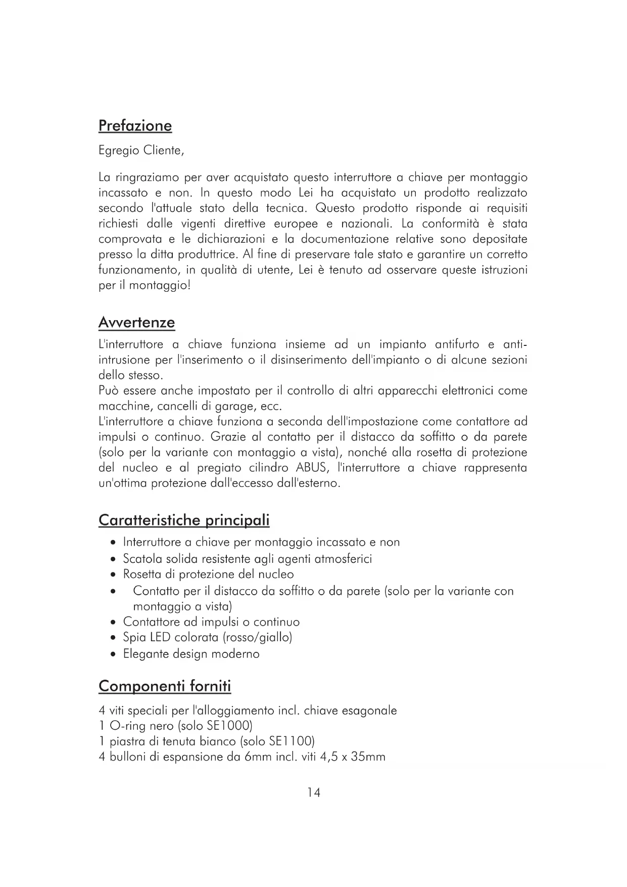- Nøglekontakt Installationsvejledning SE1000 SE110014 Prefazione Egregio Cliente, La ringraziamo per aver acquistato questo interruttore a chiave per montaggio incassato e non. In questo modo Lei ha acquistato un prodotto realizzato secondo l'attuale stato della tecnica. Questo prodotto risponde ai requisiti richiesti dalle vigenti direttive europee e nazionali. La conformità è stata comprovata e le dichiarazioni e la documentazione relative sono depositate presso la ditta produttrice. Al fine di preservare tale stato e garantire un corretto funzionamento, in qualità di utente, Lei è tenuto ad osservare queste istruzioni per il montaggio! p. 21
