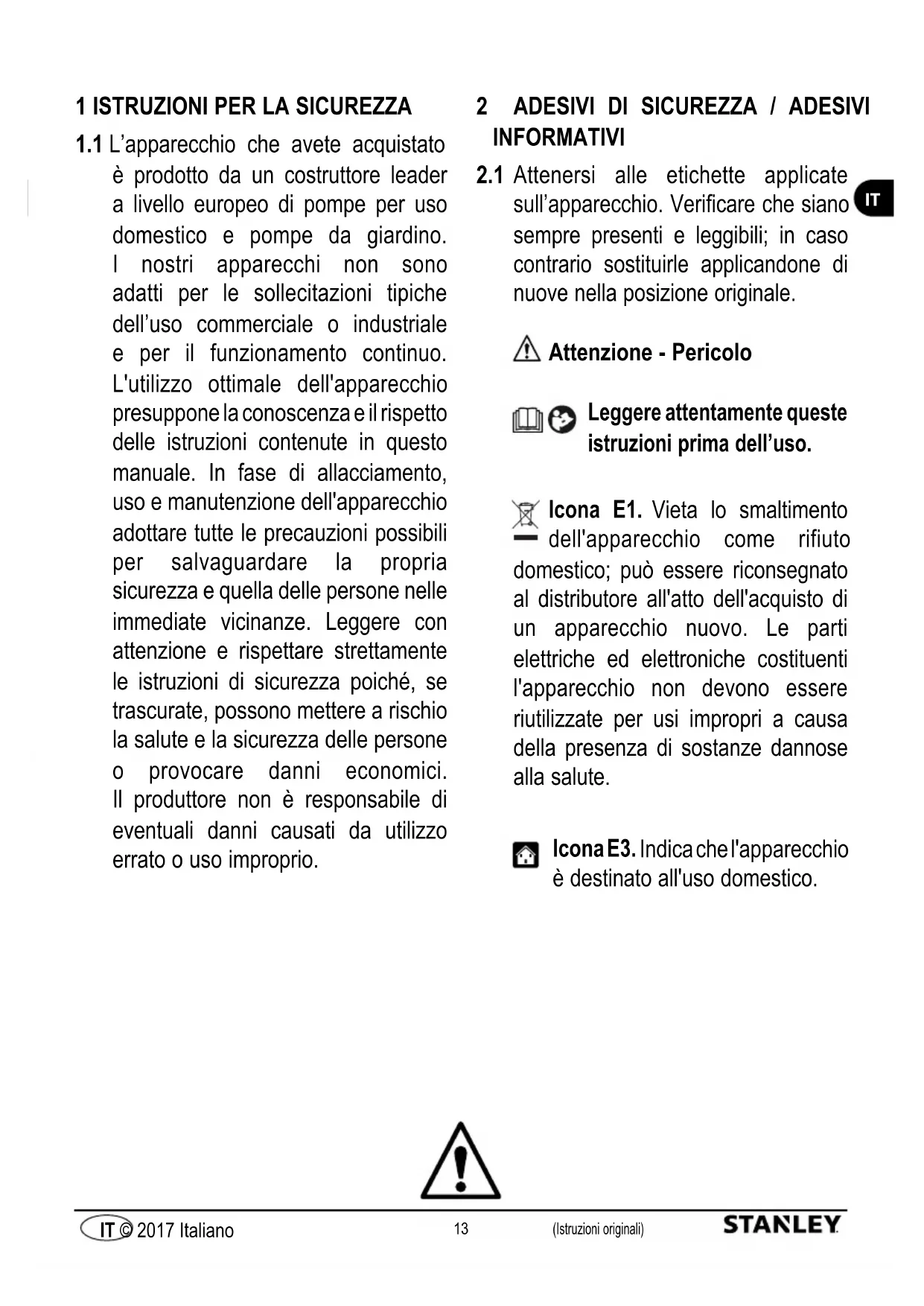 Attenersi alle etichette applicate sull’apparecchio. Verificare che siano sempre presenti e leggibili; in caso contrario sostituirle applicandone di nuove nella posizione originale. Attenzione - Pericolo Leggere attentamente queste istruzioni prima dell’uso. Icona E1. Vieta lo smaltimento dell'apparecchio come rifiuto domestico; può essere riconsegnato al distributore all'atto dell'acquisto di un apparecchio nuovo. Le parti elettriche ed elettroniche costituenti l'apparecchio non devono essere riutilizzate per usi impropri a causa della presenza di sostanze dannose alla salute. Icona E3. Indica che l'apparecchio è destinato all'uso domestico.14 (Istruzioni originali) IT © 2017 Italiano