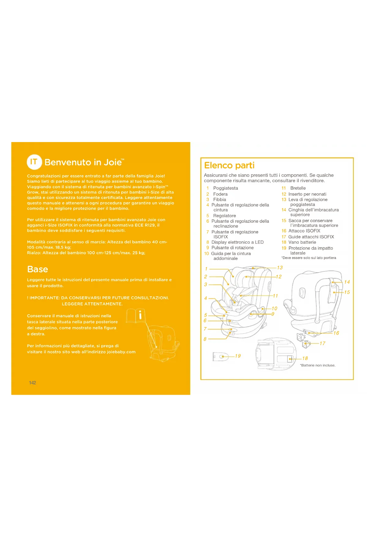 Congratulazioni per essere entrato a far parte della famiglia Joie! Siamo lieti di partecipare al tuo viaggio assieme al tuo bambino. Viaggiando con il sistema di ritenuta per bambini avanzato i-Spin™ Grow, stai utilizzando un sistema di ritenuta per bambini i-Size di alta qualità e con sicurezza totalmente certificata. Leggere attentamente questo manuale e attenersi a ogni procedura per garantire un viaggio comodo e la migliore protezione per il bambino.Per utilizzare il sistema di ritenuta per bambini avanzato Joie con agganci i-Size ISOFIX in conformità alla normativa ECE R129, il bambino deve soddisfare i seguenti requisiti.Modalità contraria al senso di marcia: Altezza del bambino 40 cm- 105 cm/max. 18,5 kg;Rialzo: Altezza del bambino 100 cm-125 cm/max. 25 kg; Base Leggere tutte le istruzioni del presente manuale prima di installare e usare il prodotto.! IMPORTANTE: DA CONSERVARSI PER FUTURE CONSULTAZIONI.LEGGERE ATTENTAMENTE.Conservare il manuale di istruzioni nella tasca laterale situata nella parte posteriore del seggiolino, come mostrato nella figura a destra.Per informazioni più dettagliate, si prega di visitare il nostro sito web all'indirizzo joiebaby.com Elenco parti 1 Poggiatesta 2 Fodera 3 Fibbia 4 Pulsante di regolazione della cintura 5 Regolatore 6 Pulsante di regolazione della reclinazione 7 Pulsante di regolazione ISOFIX 8 Display elettronico a LED 9 Pulsante di rotazione10 Guida per la cintura addominale11 Bretelle12 Inserto per neonati13 Leva di regolazione poggiatesta14 Cinghia dell’imbracatura superiore15 Sacca per conservare l’imbracatura superiore16 Attacco ISOFIX17 Guide attacchi ISOFIX 18 Vano batterie19 Protezione da impatto lateraleAssicurarsi che siano presenti tutti i componenti. Se qualche componente risulta mancante, consultare il rivenditore.