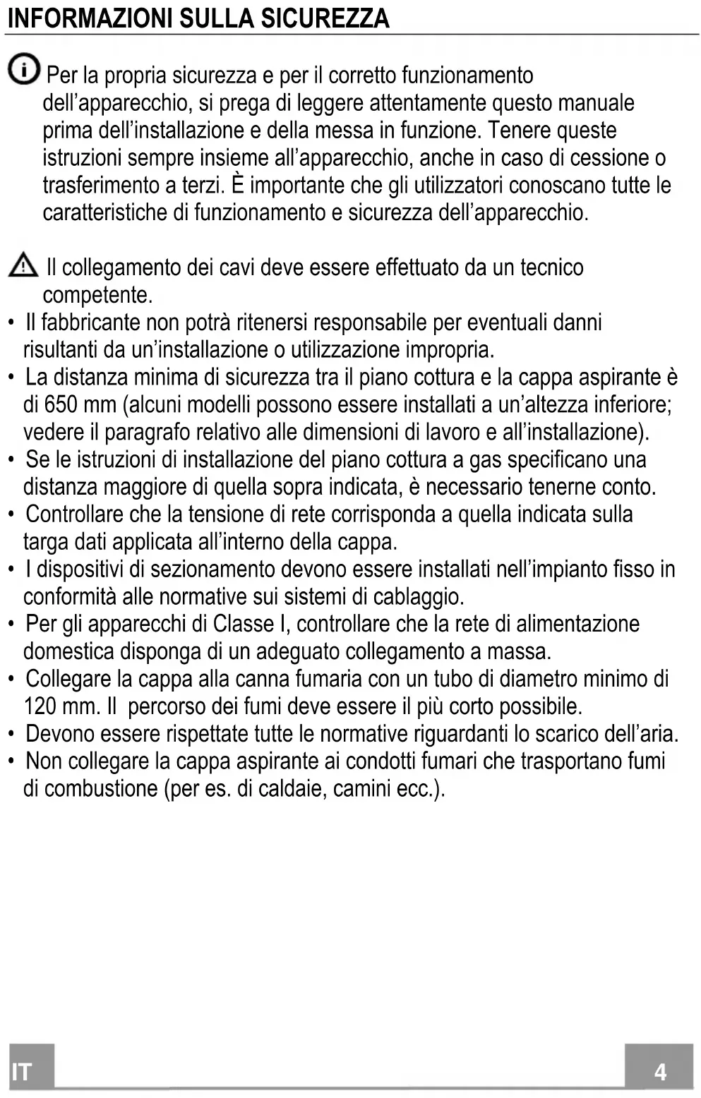 - Non collegare la cappa aspirante ai condotti fumari che trasportano fumi di combustione (per es. di caldaie, camini ecc.).IT