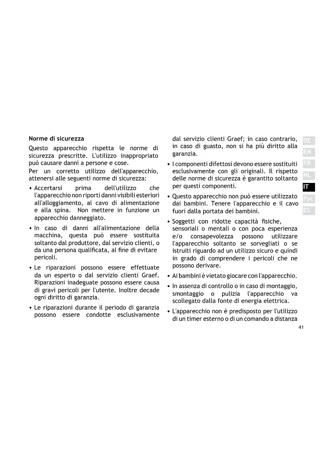 - Per inserirlo di nuovo introdurre il carello verticalmente nel piano ed agganciare la guida del carello nella scanalatura sul piano del carello. Servizio clienti In caso di guasto dell'apparecchio Graef, rivolgersi ad un centro specializzato o al servizio clienti Graef. Smaltimento Questo prodotto a conclusione del suo utilizzo non può essere gettato in un normale contenitore dei riuti, ma deve essere consegnato in un centro raccolta differenziata per il riciclo dei riuti elettronici Il simbolo presente sul prodotto e nelle istruzioni si riferisce a questo. I materiali sono riutilizzabili in base alla loro marcatura. Attraverso il riciclo, il riutilizzo dei materiali o altre forme di riutilizzo di apparecchi fuori uso, si contribuisce notevolmente alla difesa dell‘ambiente. Richieda maggiori informazioni presso la Sua amministrazione comunale riguardo alle possibilità di smaltimento. 5 anni di garanzia motore Per questo prodotto offriamo inoltre una ga- ranzia di 60 mesi a partire dalla data di acquis- to La garanzia non copre i guasti causati da un cattivo utilizzo o manomissione, come pure difetti che hanno un‘inuenza minima sulle funzioni o sul valore dell‘apparecchio. Inoltre i danni che sopraggiungono a seguito di traspor- to, nella misura in cui noi non ne siamo respon- sabili, non sono coperti da garanzia. I guasti sopraggiunti a seguito di una riparazione che non è stata effettuata né da noi né da nostri delegati, non sono coperti da garanzia. In caso di reclamo effettueremo le dovute riparazioni sul prodotto secondo i nostri criteri o provve- deremo alla sua sostituzione.48
