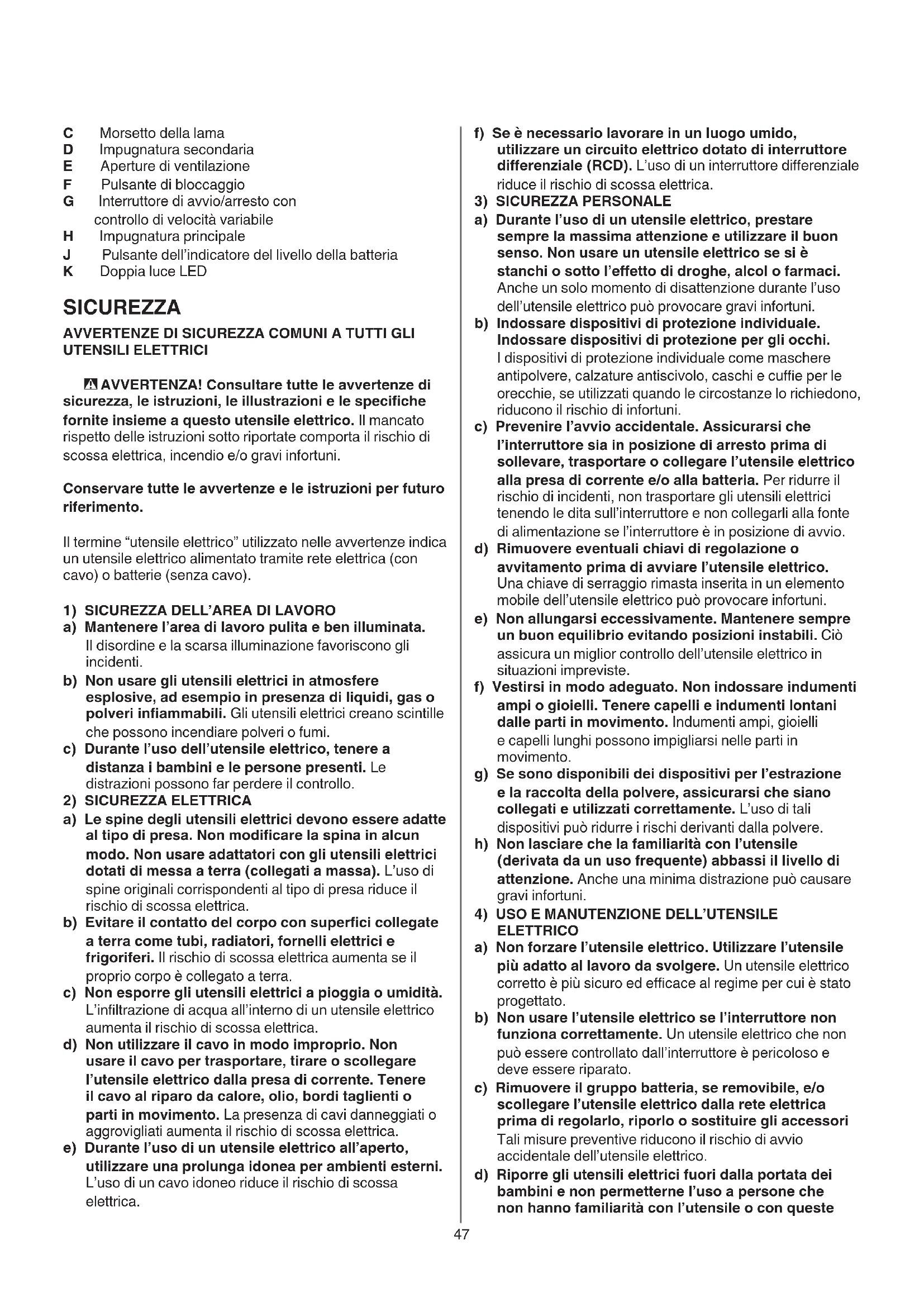 ELETTRICO a) Non forzare l’utensile elettrico. Utilizzare l’utensile più adatto al lavoro da svolgere. Un utensile elettrico corretto è più sicuro ed ecace al regime per cui è stato progettato. b) Non usare l’utensile elettrico se l’interruttore non funziona correttamente. Un utensile elettrico che non può essere controllato dall’interruttore è pericoloso e deve essere riparato. c) Rimuovere il gruppo batteria, se removibile, e/o scollegare l’utensile elettrico dalla rete elettrica prima di regolarlo, riporlo o sostituire gli accessori Tali misure preventive riducono il rischio di avvio accidentale dell’utensile elettrico. d) Riporre gli utensili elettrici fuori dalla portata dei bambini e non permetterne l’uso a persone che non hanno familiarità con l’utensile o con queste C Morsetto della lama D Impugnatura secondaria E Aperture di ventilazione F Pulsante di bloccaggio G Interruttore di avvio/arresto con controllo di velocità variabile H Impugnatura principale