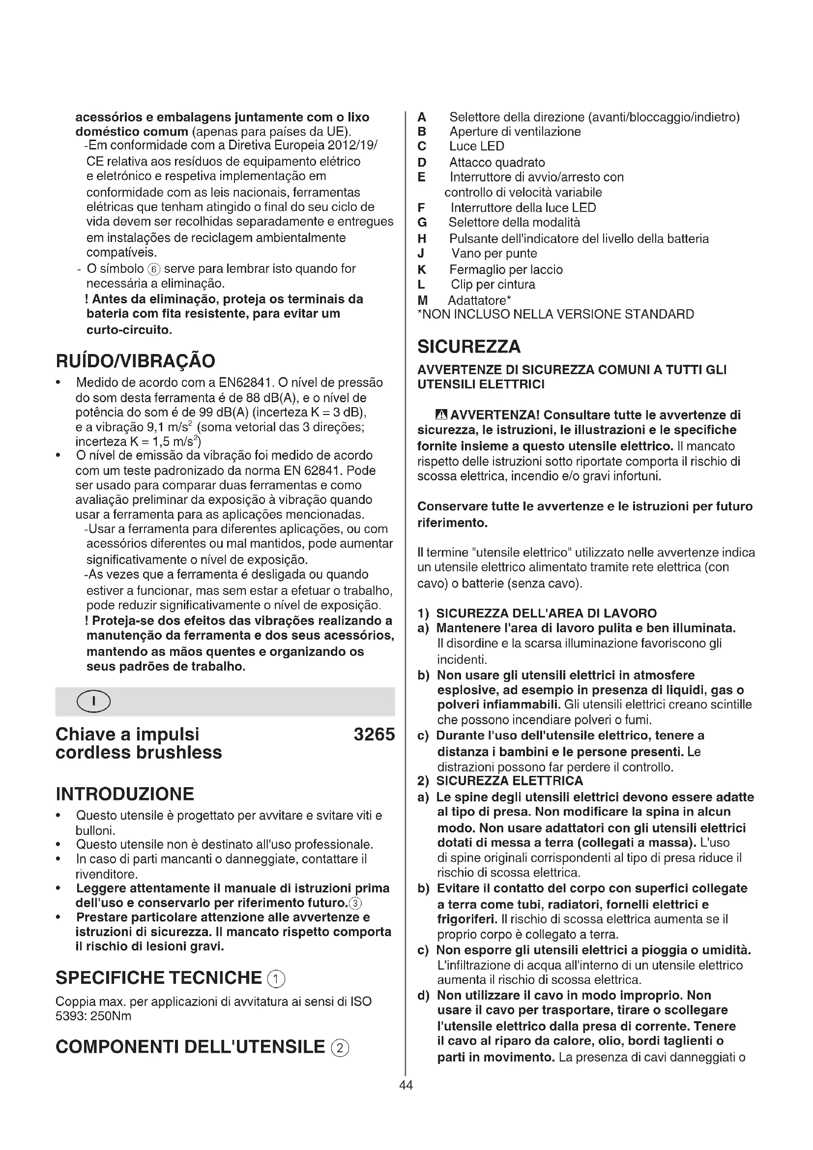 a) Le spine degli utensili elettrici devono essere adatte al tipo di presa. Non modicare la spina in alcun modo. Non usare adattatori con gli utensili elettrici dotati di messa a terra (collegati a massa). L'uso di spine originali corrispondenti al tipo di presa riduce il rischio di scossa elettrica. b) Evitare il contatto del corpo con superci collegate a terra come tubi, radiatori, fornelli elettrici e frigoriferi. Il rischio di scossa elettrica aumenta se il proprio corpo è collegato a terra. c) Non esporre gli utensili elettrici a pioggia o umidità. L'inltrazione di acqua all'interno di un utensile elettrico aumenta il rischio di scossa elettrica. d) Non utilizzare il cavo in modo improprio. Non usare il cavo per trasportare, tirare o scollegare l'utensile elettrico dalla presa di corrente. Tenere il cavo al riparo da calore, olio, bordi taglienti o parti in movimento. La presenza di cavi danneggiati o acessórios e embalagens juntamente com o lixo doméstico comum (apenas para países da UE). - Em conformidade com a Diretiva Europeia 2012/19/ CE relativa aos resíduos de equipamento elétrico e eletrónico e respetiva implementação em conformidade com as leis nacionais, ferramentas elétricas que tenham atingido o nal do seu ciclo de vida devem ser recolhidas separadamente e entregues em instalações de reciclagem ambientalmente compatíveis. - O símbolo 6 serve para lembrar isto quando for necessária a eliminação. ! Antes da eliminação, proteja os terminais da bateria com ta resistente, para evitar um curto-circuito.