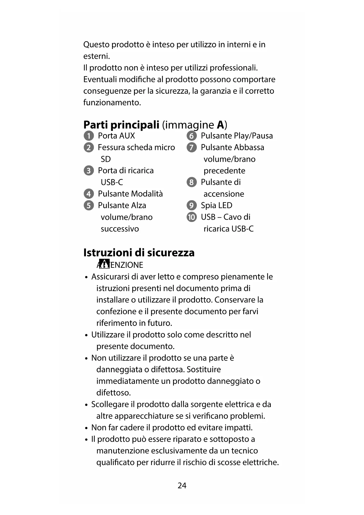 3 Porta di ricarica USB-C 4 Pulsante Modalità 5 Pulsante Alza volume/brano successivo 6 Pulsante Play/Pausa 7 Pulsante Abbassa volume/brano precedente 8 Pulsante di accensione 9 Spia LED q USB – Cavo di ricarica USB-C Istruzioni di sicurezza
