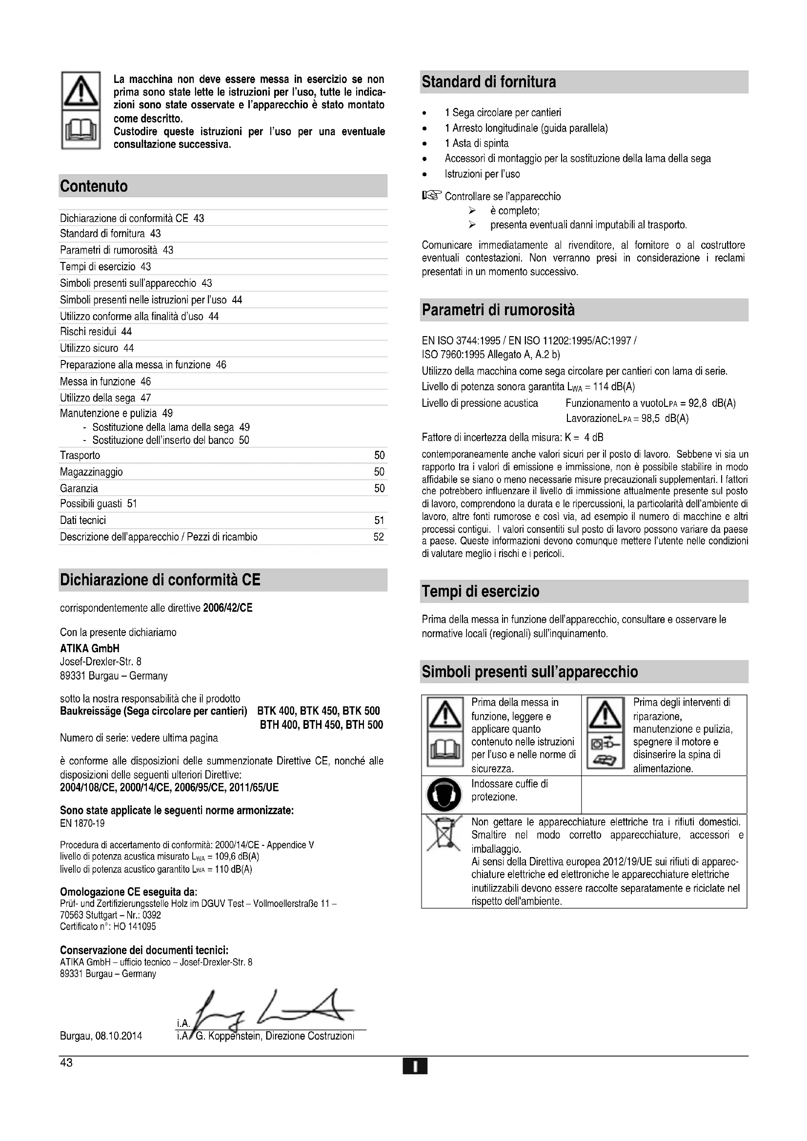 Dichiarazione di conformità CE corrispondentemente alle direttive 2006/42/CE Con la presente dichiariamo ATIKA GmbH Josef-Drexler-Str. 8 89331 Burgau – Germany sotto la nostra responsabilità che il prodotto Baukreissäge (Sega circolare per cantieri) BTK 400, BTK 450, BTK 500