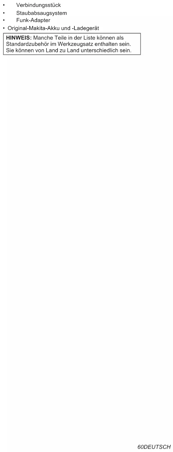 ACCESSORI OPZIONALI ATTENZIONE: Questi accessori o compo- nenti aggiuntivi sono consigliati per l’uso con l’u- tensile Makita specicato nel presente manuale. L’impiego di altri accessori o componenti aggiuntivi può costituire un rischio di lesioni alle persone. Utilizzare gli accessori o i componenti aggiuntivi solo perilloroscopopressato. Per ottenere ulteriori dettagli relativamente a questi accessori, rivolgersi a un centro di assistenza Makita.