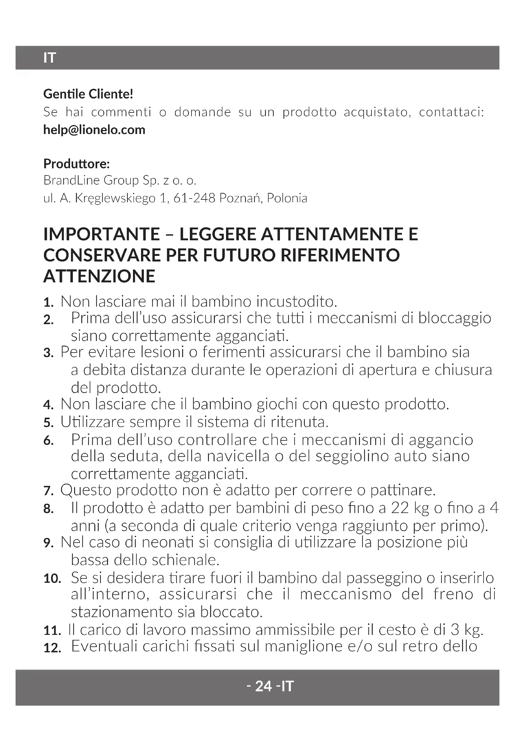 Eventuali carichi ssa sul maniglione e/o sul retro dello‑ 25 ‑ IT schienale e/o sui la del prodoo inuiranno sulla stabilità del passeggino.