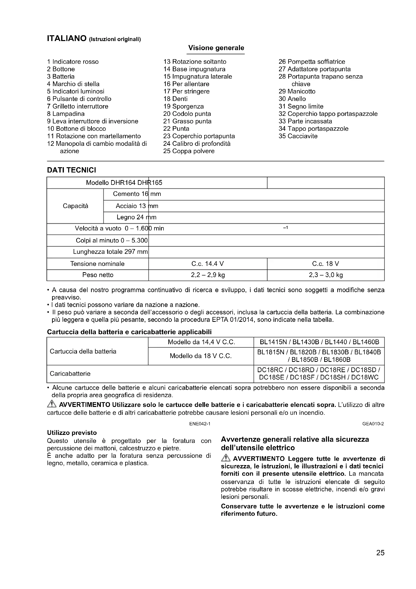 - Alcune cartucce delle batterie e alcuni caricabatterie elencati sopra potrebbero non essere disponibili a seconda della propria area geografica di residenza. AVVERTIMENTO Utilizzare solo le cartucce delle batterie e i caricabatterie elencati sopra. L’utilizzo di altre cartucce delle batterie e di altri caricabatterie potrebbe causare lesioni personali e/o un incendio. ENE042-1 Utilizzo previsto Questo utensile è progettato per la foratura con percussione dei mattoni, calcestruzzo e pietre. È anche adatto per la foratura senza percussione di legno, metallo, ceramica e plastica. GEA010-2 Avvertenze generali relative alla sicurezza dell’utensile elettrico AVVERTIMENTO Leggere tutte le avvertenze di sicurezza, le istruzioni, le illustrazioni e i dati tecnici forniti con il presente utensile elettrico. La mancata osservanza di tutte le istruzioni elencate di seguito potrebbe risultare in scosse elettriche, incendi e/o gravi lesioni personali. Conservare tutte le avvertenze e le istruzioni come riferimento futuro. Modello DHR164 DHR165 Capacità Cemento 16 mm Acciaio 13 mm Legno 24 mm Velocità a vuoto 0 – 1.600 min