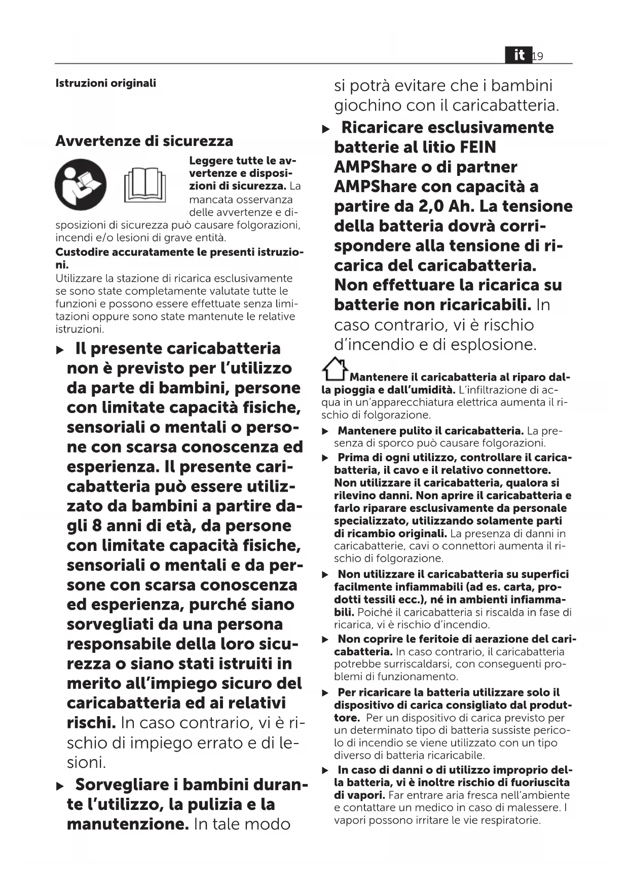 – 4,0Ah min 16/25 – 5,0Ah min 20/35 Numero di celle della batteria 5–15 Peso secondo EPTA-Procedure 01:2014 kg 0,95 20 it 34101366060 • 1.6.22Caricabatteria GAL 18V-160 Classe di protezione / II A) in funzione della temperatura e del tipo di batteria B) Stato di carica della batteria 50% (dopo la ricarica con Power Boost). La batteria può essere prelevata ed utilizzata im- mediatamente. C) Stato di carica della batteria circa 80% (dopo la ricarica con Power Boost). La batteria può essere prelevata ed utiliz- zata immediatamente. D) Stato di carica della batteria circa 80% (dopo la ricarica con modalità di carica standard). La batteria può essere prele- vata ed utilizzata immediatamente. E) Stato di carica della batteria 97– 100% (dopo la ricarica con modalità di carica standard). UtilizzoItaliano MontaggioItaliano u Prima di qualunque intervento sul caricabatte- ria estrarre la spina di rete dalla presa. Montaggio a pareteItaliano Il caricabatteria si potrà utilizzare sia poggiato (utilizzo su tavolo / Desktop Use), sia agganciato ad una parete. Per fissaggio alla parete: praticare due fori, di- stanziati come indicato nel disegno. Per il fissaggio, utilizzare viti a testa tonda, con diametro da 5mm fino a max. 6,5mm. Messa in funzioneItaliano u Attenersi alla tensione di rete La tensione della rete elettrica deve corrispondere ai dati indicati sulla targhetta di identificazione del ca- ricabatteria. I caricabatteria con l’indicazione di 230V possono essere collegati anche alla rete di 220V. Procedura di ricaricaItaliano La procedura di ricarica inizierà non appena il connettore di rete del caricabatteria verrà inne- stato nella presa di corrente e la batteria verrà in- nestata nella sede di ricarica (1). Grazie all’intelligente procedimento di ricarica, lo stato di ricarica della batteria viene riconosciuto automaticamente e l’operazione di ricarica av- viene con la rispettiva ottimale corrente di carica in base alla temperatura della batteria e della ten- sione. Questa procedura consente di non sottoporre a sforzi eccessivi la batteria che in caso di deposito nel caricabatteria resta sempre completamente carica. Significato degli elementi di visualizzazioneItaliano Indicatore verde del livello di carica della batteria (3)Italiano I 5 LED verdi LED indicano il livello di carica della batteria durante e dopo il processo di ricarica. Un LED con luce accesa fissa indica una capacità della batteria del 20% circa. LED di stato Capacità del- la batteria, circa I 5 LED si accendono in suc- cessione. < 20% Il LED più in basso si accende con luce fissa. 20% I 2 LED più in basso si accen- dono con luce fissa. 40% I 3 LED più in basso si accen- dono con luce fissa. 60% I 4 LED più in basso si accen- dono con luce fissa. 80% I 5 LED si accendono con luce fissa. > 95% Avvertenza: La procedura di ricarica sarà possi- bile soltanto se la temperatura della batteria si troverà nel campo temperatura di ricarica con- sentito: vedi paragrafo «Dati tecnici». it 21 34101366060 • 1.6.22Indicatore rosso monitoraggio temperatura/ errori (5)Italiano Luce permanenteItaliano La luce fissa rossa segnala che la tem- peratura della batteria è oltre l’inter- vallo di temperatura della ricarica am- messo, vedere paragrafo «Dati tecni- ci». Non appena viene raggiunto il campo di temperatura consentito, inizia la procedura di ri- carica. Luce lampeggianteItaliano La luce lampeggiante rossa segnala che la batteria o il caricabatteria sono difettosi. Tasto Power Boost(4)Italiano Premendo il tasto Power Boost(4) si attiva la modalità di ricarica rapida. Ciò può essere effet- tuato prima di inserire la batteria o con batteria inserita. Il tasto Power Boost(4) si accende in rosso durante la ricarica rapida. Premendo anco- ra una volta il tasto Power Boost si ritorna alla modalità di ricarica standard. Una volta terminata la ricarica rapida (raggiungi- mento del 50% circa della capacità della batteria), il tasto Power Boost(4) si spegne. Se la batteria resterà nel caricabatteria, proseguirà ad essere ri- caricata. Segnale acusticoItaliano Non appena terminato il ciclo di ricarica, verrà emesso un breve segnale acustico. Anomalie - Cause e rimediItaliano Causa Rimedio L’indicatore rosso monitoraggio temperatu- ra/errori(5) lampeggia Procedura di ricarica non possibile La batteria non è inseri- ta (correttamente) Inserire correttamente la batteria nella stazio- ne di ricarica Contatti della batteria contaminati Pulire i contatti della batteria, ad es. inne- stando e disinnestando più volte la batteria stessa; all’occorrenza, sostituire la batteria Batteria difettosa Sostituire la batteria Caricabatteria difettoso All’occorrenza, far con- trollare il caricabatteria da un Centro Assisten- za Clienti autorizzato per elettroutensili FEIN L’indicatore verde del livello di carica della batteria(3) non si accende Causa Rimedio La spina di alimentazio- ne della stazione di ri- carica non è inserita (correttamente) Inserire (completamen- te) la spina di alimenta- zione nella presa di corrente Difetto nella presa di corrente, nel cavo di alimentazione o nella stazione di ricarica Verificare la tensione di rete e, all’occorrenza, far controllare il carica- batteria da un Centro Assistenza Clienti auto- rizzato per elettroutensiliFEIN Indicazioni operativeItaliano Una sensibile riduzione della durata del funziona- mento dopo l’operazione di ricarica sta ad indi- care che la batteria dovrà essere sostituita. In caso di cicli di ricarica continui oppure in caso di operazioni di ricarica successivi senza interru- zioni, il caricabatteria si può riscaldare. Ciò, tutta- via, non rappresenta un pericolo e non indica un difetto tecnico del caricabatteria. Raffreddamento della batteria ricaricabile (Active Air Cooling)Italiano Il sistema di ventilazione integrato nel caricabat- teria controlla la temperatura della batteria inseri- ta. Non appena la temperatura della batteria sale s