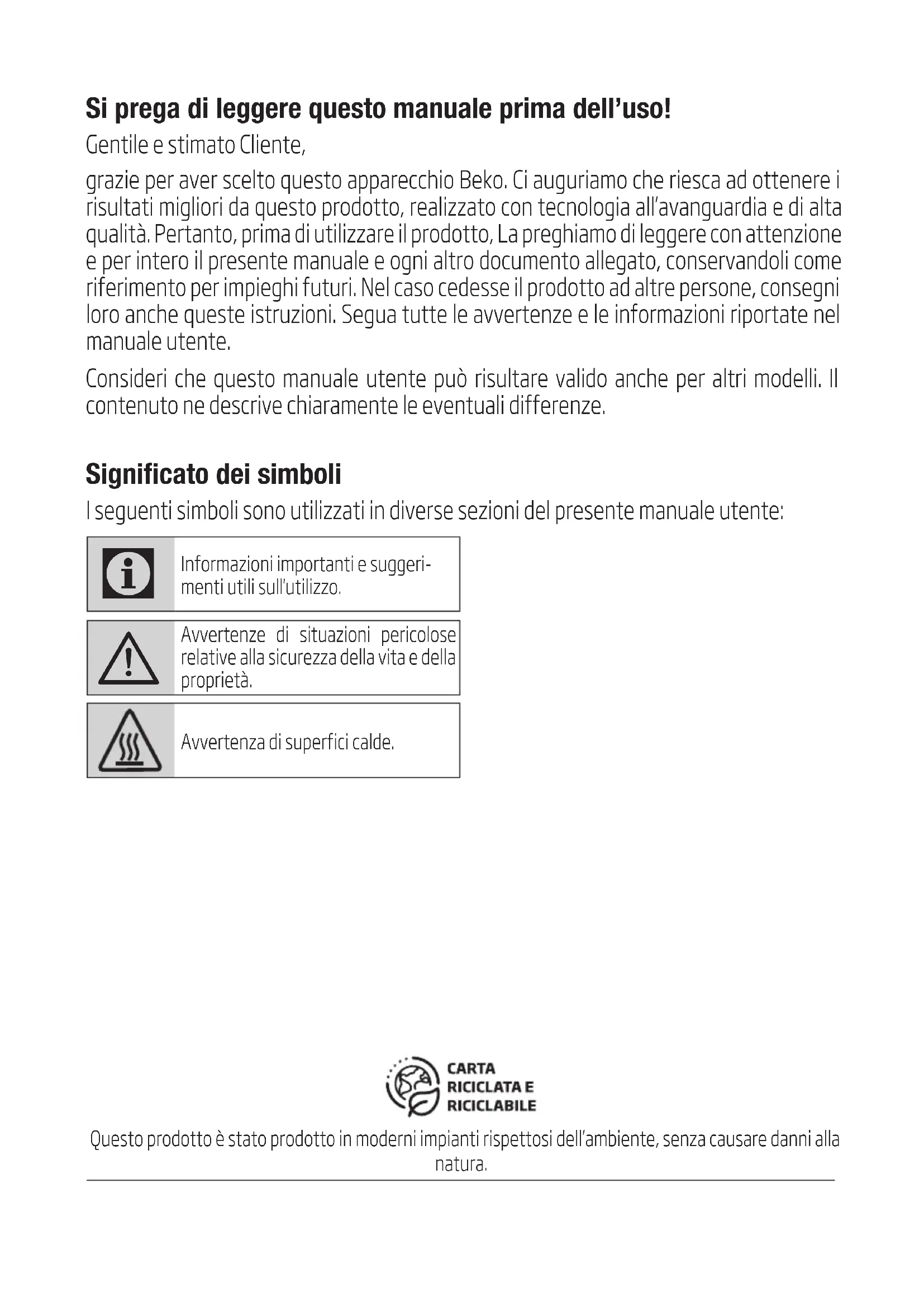 - Transportez l'appareil dans une position nor- male. Évitez de le pencher vers l'avant ou vers l'arrière.Si prega di leggere questo manuale prima dell’uso! Gentile e stimato Cliente, grazie per aver scelto questo apparecchio Beko. Ci auguriamo che riesca ad ottenere i risultati migliori da questo prodotto, realizzato con tecnologia all’avanguardia e di alta qualità. Pertanto, prima di utilizzare il prodotto, La preghiamo di leggere con attenzione e per intero il presente manuale e ogni altro documento allegato, conservandoli come riferimento per impieghi futuri. Nel caso cedesse il prodotto ad altre persone, consegni loro anche queste istruzioni. Segua tutte le avvertenze e le informazioni riportate nel manuale utente. Consideri che questo manuale utente può risultare valido anche per altri modelli. Il contenuto ne descrive chiaramente le eventuali differenze. Significato dei simboli I seguenti simboli sono utilizzati in diverse sezioni del presente manuale utente: