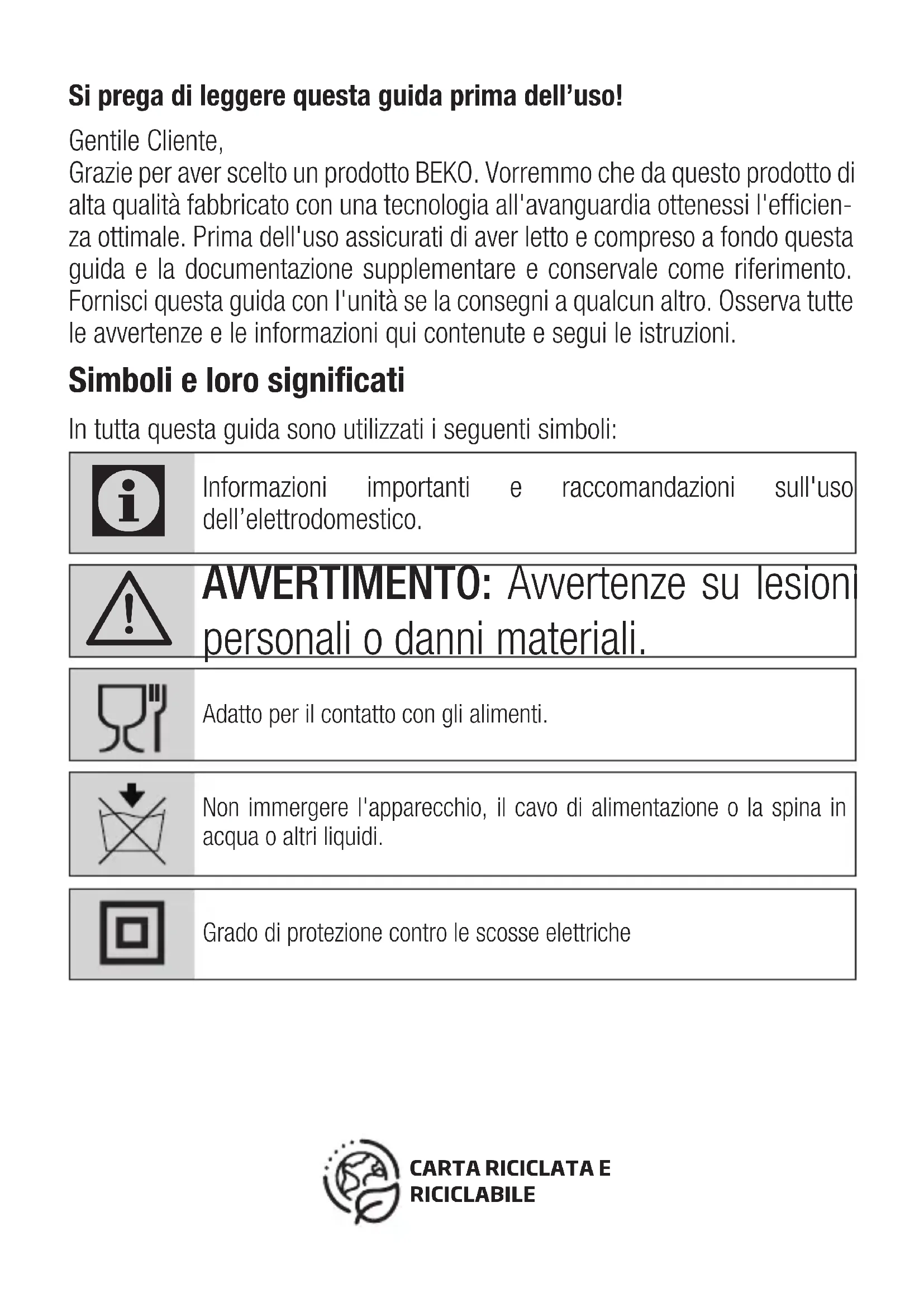 - In caso di caduta, l'elettrodomestico potrebbe non funzionare o potrebbe subire danni permanenti.CERTIFICATO DI GARANZIA La presente garanzia commerciale si intende aggiuntiva e non sostitutiva di ogni altro diritto di cui gode il consumatore, intendendo per consumatore esclusivamente colui che utilizza il bene per scopi estra- nei all’attività imprenditoriale o professionale eventualmente svolta e pertanto per uso domestico/ privato, e in particolare non pregiudica in alcun modo i dritti del consumatore stabiliti dal Dlgs 206/05. BEKO Italy S.r.l. in conformità alla facoltà prevista dalla legge, offre al consumatore una garanzia com- merciale aggiuntiva, nei termini e nei modi di seguito indicati. Questo certificato non deve essere spedito per la convalida. E’ valido e operante solo se conservato assieme alla ricevuta fiscale o altro documento reso fiscalmente obbligatorio. Condizioni di Garanzia