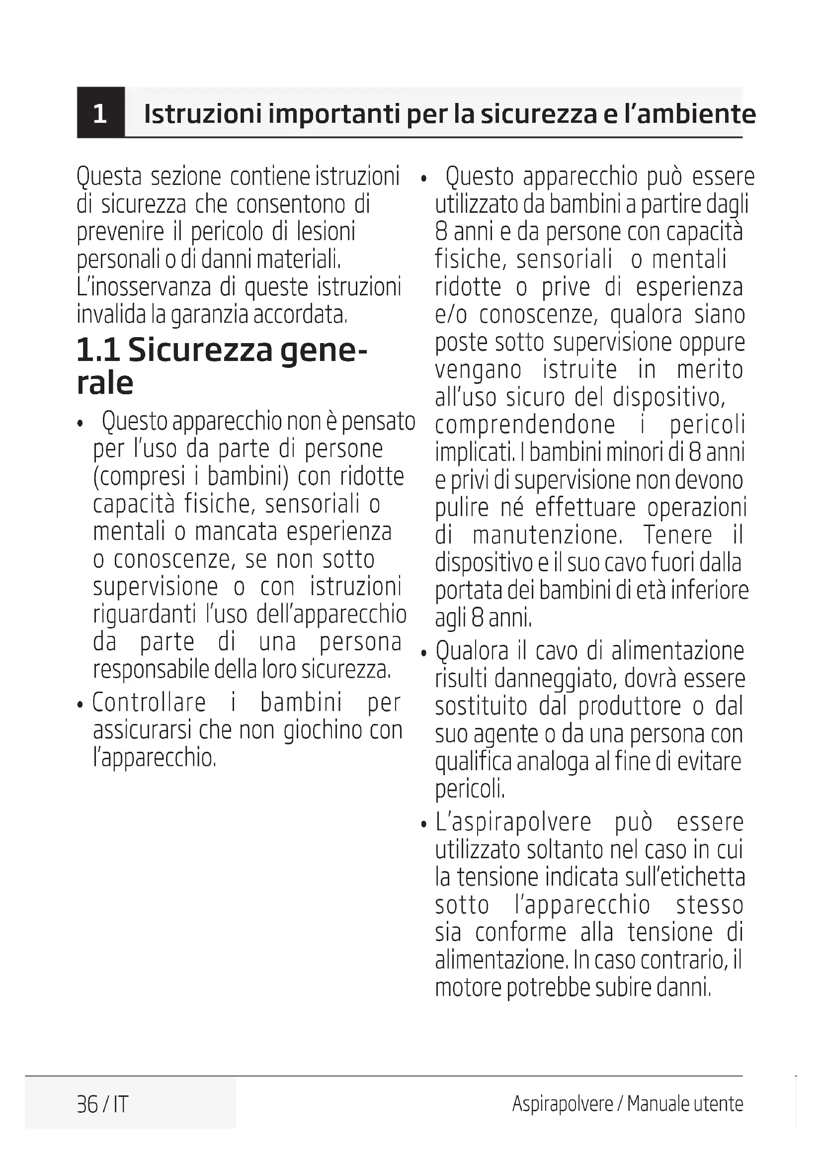 36 / IT Aspirapolvere / Manuale utente 1 Istruzioniimportantiperlasicurezzael’ambiente Questa sezione contiene istruzioni di sicurezza che consentono di prevenire il pericolo di lesioni personali o di danni materiali. L’inosservanza di queste istruzioni invalida la garanzia accordata. 1.1Sicurezzagene- rale