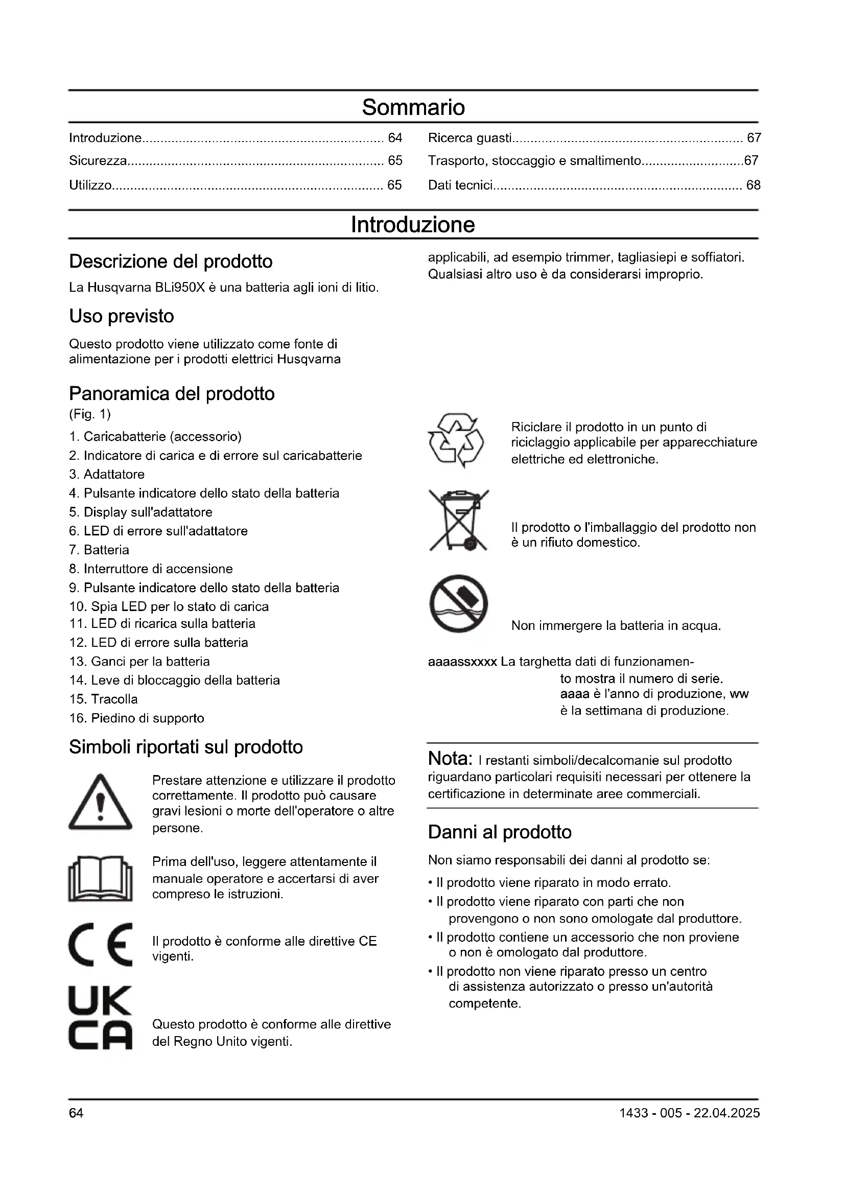 BLi950X - Batteria HUSQVARNA - Manuale utente e istruzioni gratuiti