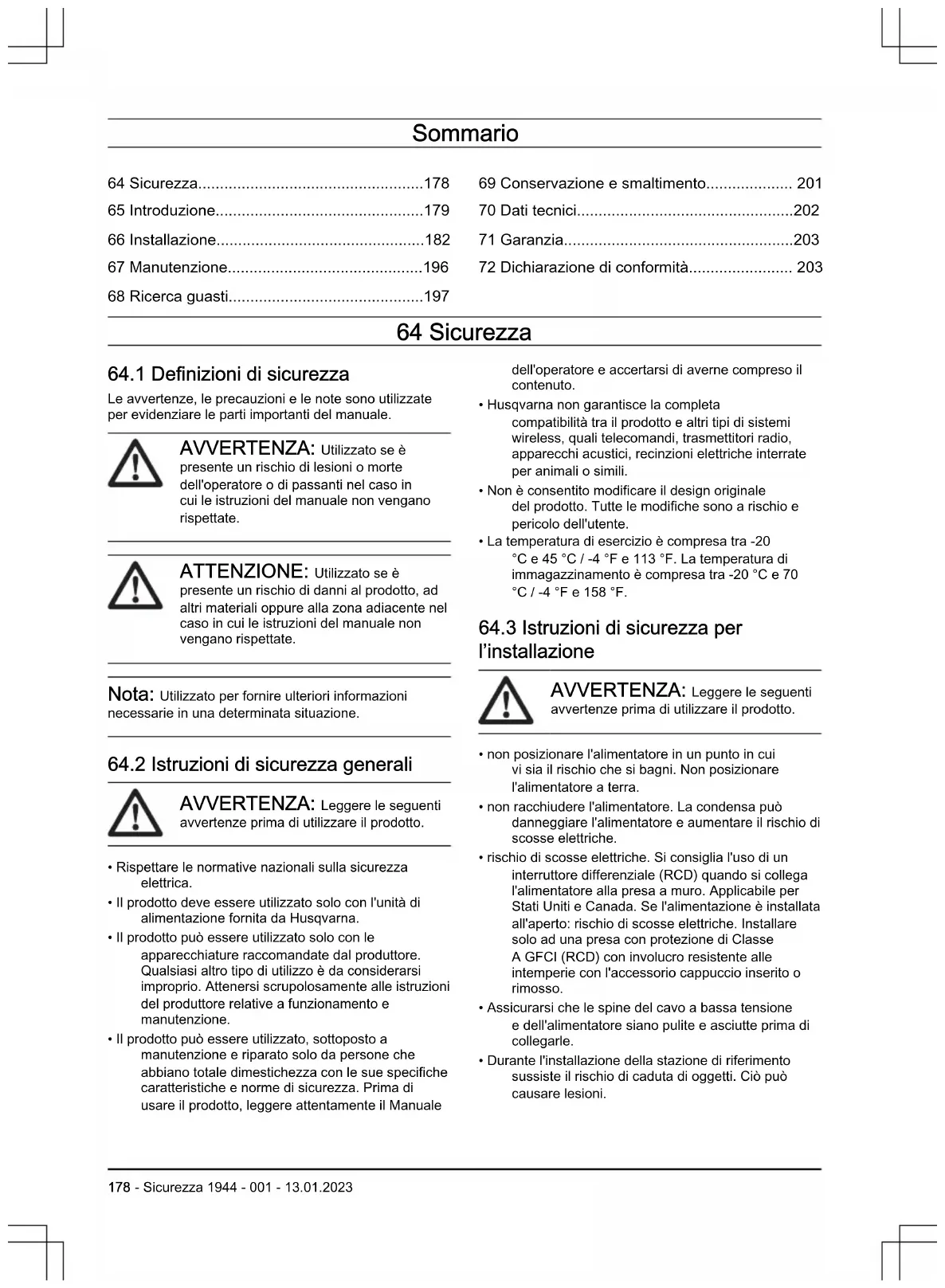Robot tagliaerba non incluso. 1944 - 001 - 13.01.2023 Introduzione - 181Utilizzare un alimentatore ri- movibile come riportato sulla targhetta dati di funzionamen- to accanto al simbolo. Il telaio contiene componenti sensibili alle scariche elettrostatiche (ESD). Il telaio deve essere aperto e sigillato esclusivamente da un tecnico di assistenza autorizzato. La garanzia non è applicabile in caso di rottura del sigillo. Nota: I restanti simboli/decalcomanie sul prodotto riguardano particolari requisiti necessari per ottenere la certificazione in alcuni mercati.