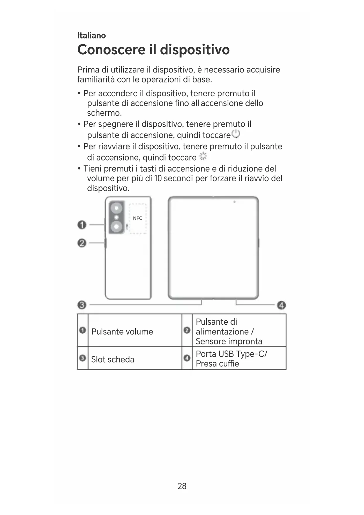 Pulsante volume Pulsante di alimentazione / Sensore impronta Slot scheda Poa USB Type-C/ Presa cue 28• Durante l'utilizzo della funzione NFC, tenere l'area NFC in prossimità di altri oggetti o dispositivi.