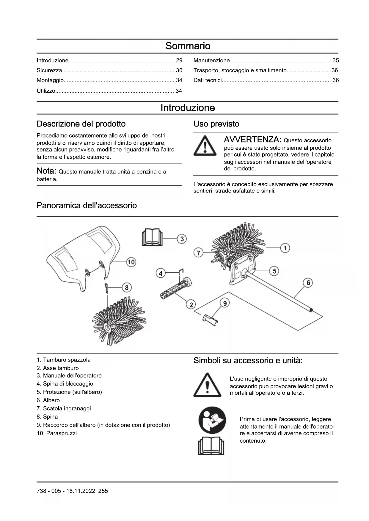 - Dati tecnici Introduzione Descrizione del prodotto Procediamo costantemente allo sviluppo dei nostri prodotti e ci riserviamo quindi il diritto di apportare, senza alcun preavviso, modifiche riguardanti fra l’altro la forma e l’aspetto esteriore. Nota: Questo manuale tratta unità a benzina e a batteria. Uso previsto AVVERTENZA: Questo accessorio può essere usato solo insieme al prodotto per cui è stato progettato, vedere il capitolo sugli accessori nel manuale dell'operatore del prodotto. L'accessorio è concepito esclusivamente per spazzare sentieri, strade asfaltate e simili. Panoramica dell'accessorio p. 36