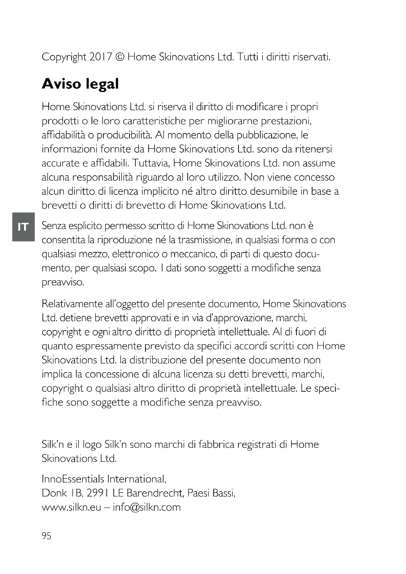 Copyright 2017 © Home Skinovations Ltd. Tutti i diritti riservati. Aviso legal Home Skinovations Ltd. si riserva il diritto di modificare i propri prodotti o le loro caratteristiche per migliorarne prestazioni, adabilità o producibilità. Al momento della pubblicazione, le informazioni fornite da Home Skinovations Ltd. sono da ritenersi accurate e adabili. Tuttavia, Home Skinovations Ltd. non assume alcuna responsabilità riguardo al loro utilizzo. Non viene concesso alcun diritto di licenza implicito né altro diritto desumibile in base a brevetti o diritti di brevetto di Home Skinovations Ltd. Senza esplicito permesso scritto di Home Skinovations Ltd. non è consentita la riproduzione né la trasmissione, in qualsiasi forma o con qualsiasi mezzo, elettronico o meccanico, di parti di questo docu- mento, per qualsiasi scopo. I dati sono soggetti a modifiche senza preavviso. Relativamente all’oggetto del presente documento, Home Skinovations Ltd. detiene brevetti approvati e in via d’approvazione, marchi, copyright e ogni altro diritto di proprietà intellettuale. Al di fuori di quanto espressamente previsto da specifici accordi scritti con Home Skinovations Ltd. la distribuzione del presente documento non implica la concessione di alcuna licenza su detti brevetti, marchi, copyright o qualsiasi altro diritto di proprietà intellettuale. Le speci- fiche sono soggette a modifiche senza preavviso. Silk’n e il logo Silk’n sono marchi di fabbrica registrati di Home Skinovations Ltd. InnoEssentials International, Donk 1B, 2991 LE Barendrecht, Paesi Bassi, www.silkn.eu – info@silkn.com96