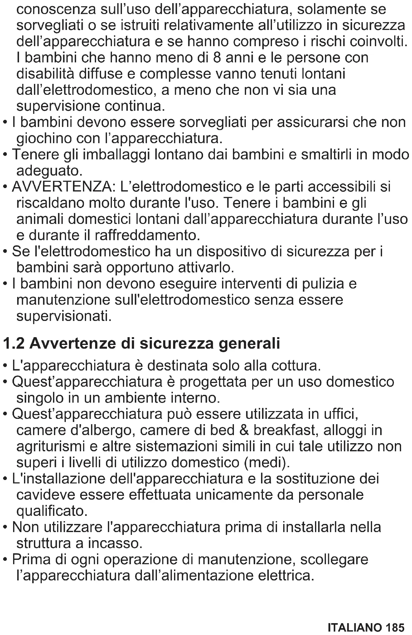 - Quest’apparecchiatura può essere usata da bambini a partire da 8 anni di età e da adulti con capacità fisiche, sensoriali o mentali limitate o con scarsa esperienza e 184 ITALIANOconoscenza sull’uso dell’apparecchiatura, solamente se sorvegliati o se istruiti relativamente all’utilizzo in sicurezza dell’apparecchiatura e se hanno compreso i rischi coinvolti. I bambini che hanno meno di 8 anni e le persone con disabilità diffuse e complesse vanno tenuti lontani dall’elettrodomestico, a meno che non vi sia una supervisione continua.