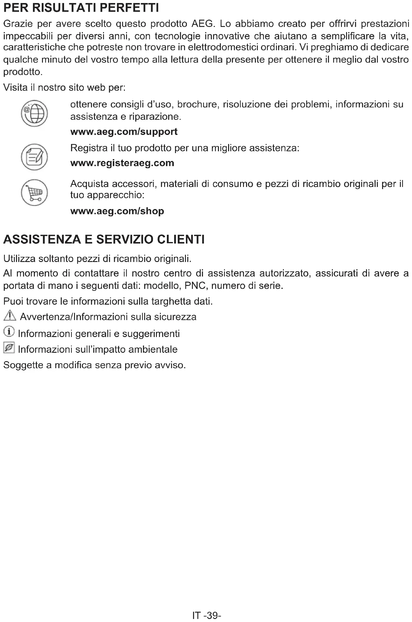 Grazie per avere scelto questo prodotto AEG. Lo abbiamo creato per offrirvi prestazioni impeccabili per diversi anni, con tecnologie innovative che aiutano a semplificare la vita, caratteristiche che potreste non trovare in elettrodomestici ordinari. Vi preghiamo di dedicare qualche minuto del vostro tempo alla lettura della presente per ottenere il meglio dal vostro prodotto. Visita il nostro sito web per: ottenere consigli d’uso, brochure, risoluzione dei problemi, informazioni su assistenza e riparazione. www.aeg.com/support Registra il tuo prodotto per una migliore assistenza: www.registeraeg.com Acquista accessori, materiali di consumo e pezzi di ricambio originali per il tuo apparecchio: www.aeg.com/shop