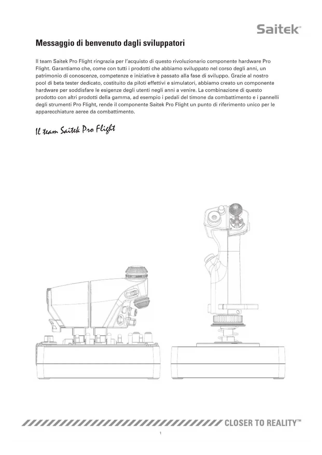 Messaggio di benvenuto dagli sviluppatori Il team Saitek Pro Flight ringrazia per l’acquisto di questo rivoluzionario componente hardware Pro Flight. Garantiamo che, come con tutti i prodotti che abbiamo sviluppato nel corso degli anni, un patrimonio di conoscenze, competenze e iniziative è passato alla fase di sviluppo. Grazie al nostro pool di beta tester dedicato, costituito da piloti effettivi e simulatori, abbiamo creato un componente hardware per soddisfare le esigenze degli utenti negli anni a venire. La combinazione di questo prodotto con altri prodotti della gamma, ad esempio i pedali del timone da combattimento e i pannelli degli strumenti Pro Flight, rende il componente Saitek Pro Flight un punto di riferimento unico per le apparecchiature aeree da combattimento. Il team Saitek Pro Flight2