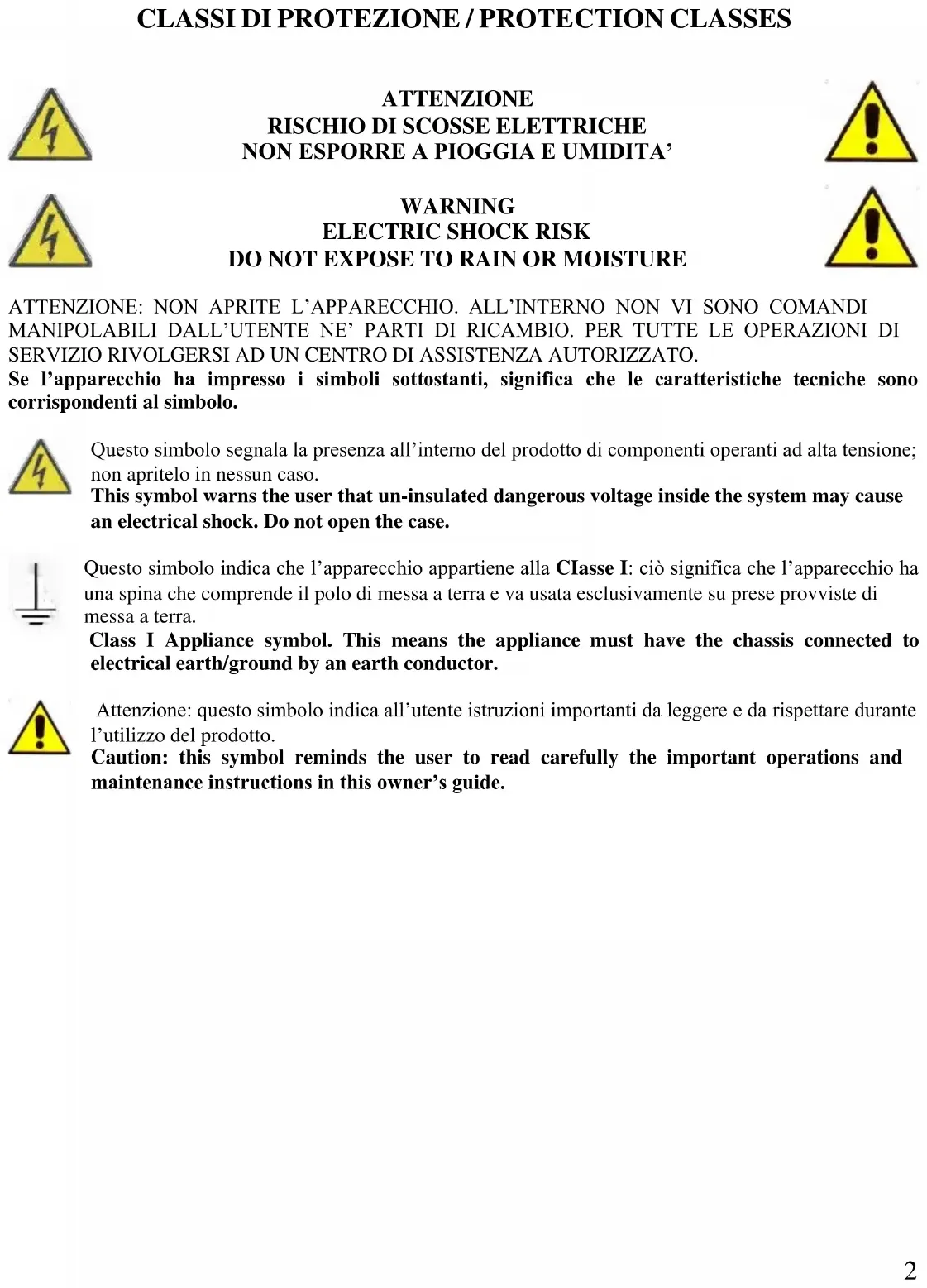 DO NOT EXPOSE TO RAIN OR MOISTURE ATTENZIONE: NON APRITE L’APPARECCHIO. ALL’INTERNO NON VI SONO COMANDI MANIPOLABILI DALL’UTENTE NE’ PARTI DI RICAMBIO. PER TUTTE LE OPERAZIONI DI SERVIZIO RIVOLGERSI AD UN CENTRO DI ASSISTENZA AUTORIZZATO. Se l’apparecchio ha impresso i simboli sottostanti, significa che le caratteristiche tecniche sono corrispondenti al simbolo. Questo simbolo segnala la presenza all’interno del prodotto di componenti operanti ad alta tensione; non apritelo in nessun caso. This symbol warns the user that un-insulated dangerous voltage inside the system may cause an electrical shock. Do not open the case. Questo simbolo indica che l’apparecchio appartiene alla CIasse I: ciò significa che l’apparecchio ha una spina che comprende il polo di messa a terra e va usata esclusivamente su prese provviste di messa a terra. Class I Appliance symbol. This means the appliance must have the chassis connected to electrical earth/ground by an earth conductor. Attenzione: questo simbolo indica all’utente istruzioni importanti da leggere e da rispettare durante l’utilizzo del prodotto. Caution: this symbol reminds the user to read carefully the important operations and maintenance instructions in this owner’s guide.3