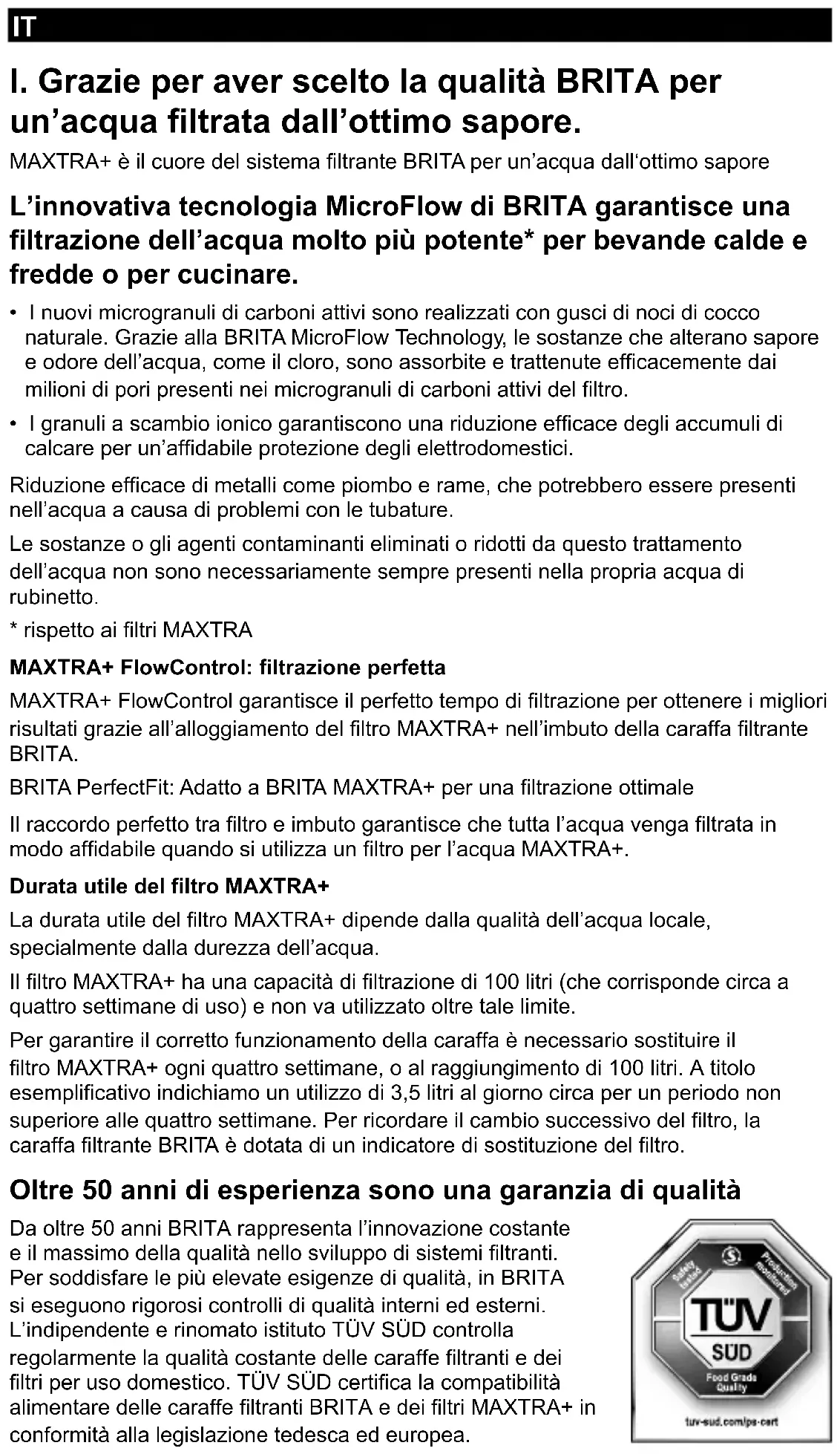 - Fosfati Per garantire il corretto funzionamento e l’igiene della caraffa è necessario sostituire il filtro MAXTRA+ ogni quattro settimane, o al raggiungimento di 100 litri di filtrazione. I filtri originali BRITA contengono un mix di scambiatori ionici e carboni attivi, testati per la compatibilità alimentare. Gli scambiatori ionici riducono la presenza di alcuni metalli nella vostra acqua di rubinetto, come piombo e rame ed anche la durezza temporanea se presente in quantità rilevante nell’acqua utilizzata per la filtrazione, prevenendo così la formazione del calcare. Potete richiedere informazioni circa la durezza temporanea dell‘acqua all‘acquedotto di competenza del luogo in cui prelevate l‘acqua. I carboni attivi riducono, ad esempio, il cloro e i suoi composti, che alterano il gusto. 1 Parametri dell’acqua secondo le procedure di verifica applicate 2 DIN 10521: L’acqua di riferimento per la verifica è conforme allo standard DIN EN 60734, procedura B, 3 mmol/l durezza totale. Ca: 89 mg/l, Mg: 19 mg/l, HCO3: 244 mg/l, Cl: 166 mg/l, SO4: 74 mg/l, Na: 92 mg/l. Concentrazione di rame nell‘acqua di riferimento per la verifica: 2 mg/l +/-20 %Concentrazione di piombo nell‘acqua di riferimento per la verifica: 100 |jg/l +/-20 %NL