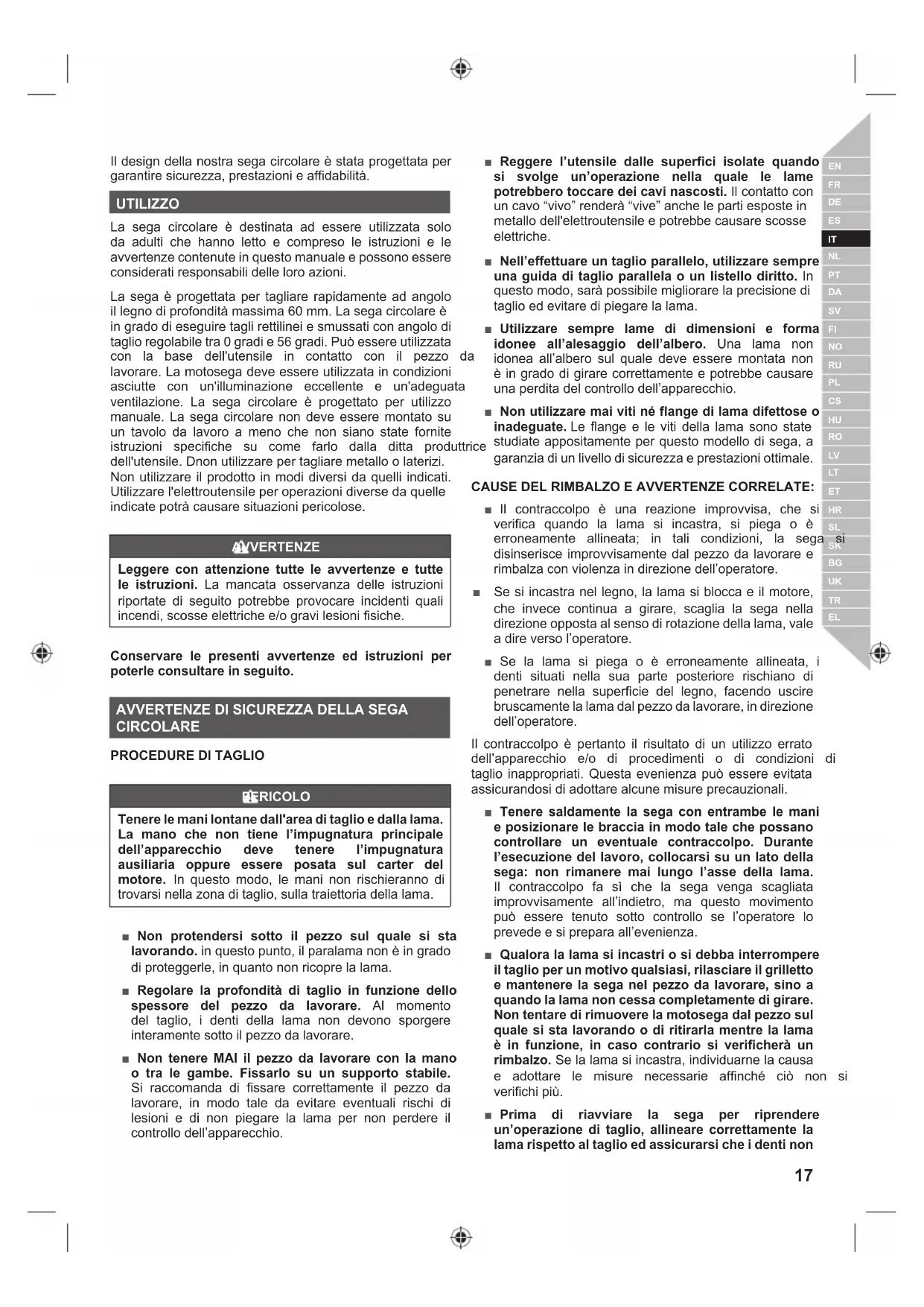 PERICOLO Tenere le mani lontane dall'area di taglio e dalla lama. La mano che non tiene l’impugnatura principale dell’apparecchio deve tenere l’impugnatura ausiliaria oppure essere posata sul carter del motore. In questo modo, le mani non rischieranno di trovarsi nella zona di taglio, sulla traiettoria della lama. Ŷ Non protendersi sotto il pezzo sul quale si sta lavorando. in questo punto, il paralama non è in grado di proteggerle, in quanto non ricopre la lama. Ŷ Regolare la profondità di taglio in funzione dello spessore del pezzo da lavorare. Al momento del taglio, i denti della lama non devono sporgere interamente sotto il pezzo da lavorare. Ŷ Non tenere MAI il pezzo da lavorare con la mano o tra le gambe. Fissarlo su un supporto stabile. Si raccomanda di fissare correttamente il pezzo da lavorare, in modo tale da evitare eventuali rischi di lesioni e di non piegare la lama per non perdere il controllo dell’apparecchio. Ŷ Reggere l’utensile dalle superfici isolate quando si svolge un’operazione nella quale le lame potrebbero toccare dei cavi nascosti. Il contatto con XQFDYR³YLYR´UHQGHUj³YLYH´DQFKHOHSDUWLHVSRVWHLQ PHWDOORGHOOHOHWWURXWHQVLOHHSRWUHEEHFDXVDUHVFRVVH elettriche. Ŷ Nell’effettuare un taglio parallelo, utilizzare sempre una guida di taglio parallela o un listello diritto. In TXHVWRPRGRVDUjSRVVLELOHPLJOLRUDUHODSUHFLVLRQHGL taglio ed evitare di piegare la lama. Ŷ Utilizzare sempre lame di dimensioni e forma idonee all’alesaggio dell’albero. Una lama non idonea all’albero sul quale deve essere montata non è in grado di girare correttamente e potrebbe causare una perdita del controllo dell’apparecchio. Ŷ Non utilizzare mai viti né flange di lama difettose o inadeguate. Le flange e le viti della lama sono state studiate appositamente per questo modello di sega, a garanzia di un livello di sicurezza e prestazioni ottimale. CAUSE DEL RIMBALZO E AVVERTENZE CORRELATE: Ŷ Il contraccolpo è una reazione improvvisa, che si verifica quando la lama si incastra, si piega o è HUURQHDPHQWH DOOLQHDWD LQ WDOL FRQGL]LRQL OD VHJD VL disinserisce improvvisamente dal pezzo da lavorare e rimbalza con violenza in direzione dell’operatore. Ŷ Se si incastra nel legno, la lama si blocca e il motore, che invece continua a girare, scaglia la sega nella direzione opposta al senso di rotazione della lama, vale a dire verso l’operatore. Ŷ Se la lama si piega o è erroneamente allineata, i denti situati nella sua parte posteriore rischiano di penetrare nella superficie del legno, facendo uscire bruscamente la lama dal pezzo da lavorare, in direzione dell’operatore. Il contraccolpo è pertanto il risultato di un utilizzo errato GHOO¶DSSDUHFFKLR HR GL SURFHGLPHQWL R GL FRQGL]LRQL GL taglio inappropriati. Questa evenienza può essere evitata assicurandosi di adottare alcune misure precauzionali. Ŷ Tenere saldamente la sega con entrambe le mani e posizionare le braccia in modo tale che possano controllare un eventuale contraccolpo. Durante l’esecuzione del lavoro, collocarsi su un lato della sega: non rimanere mai lungo l’asse della lama. Il contraccolpo fa sì che la sega venga scagliata improvvisamente all’indietro, ma questo movimento può essere tenuto sotto controllo se l’operatore lo prevede e si prepara all’evenienza. Ŷ Qualora la lama si incastri o si debba interrompere il taglio per un motivo qualsiasi, rilasciare il grilletto e mantenere la sega nel pezzo da lavorare, sino a quando la lama non cessa completamente di girare. Non tentare di rimuovere la motosega dal pezzo sul quale si sta lavorando o di ritirarla mentre la lama è in funzione, in caso contrario si verificherà un rimbalzo. Se la lama si incastra, individuarne la causa H DGRWWDUH OH PLVXUH QHFHVVDULH DIILQFKp FLz QRQ VL verifichi più. Ŷ Prima di riavviare la sega per riprendere un’operazione di taglio, allineare correttamente la lama rispetto al taglio ed assicurarsi che i denti non18 | Italiano tocchino il pezzo da lavorare. Se la lama è incastrata nel pezzo da lavorare, al momento della messa in funzione della sega può verificarsi un contraccolpo. Ŷ Non dimenticare di sorreggere i pezzi lunghi, onde evitare che la lama si incastri e limitare pertanto i rischi di contraccolpo. I pezzi lunghi tendono infatti a flettersi sotto il loro stesso peso. È possibile sistemare appositi supporti su entrambi i lati del pezzo, accanto DOODOLQHDGLWDJOLRHDOLYHOORGHOO¶HVWUHPLWjGHOSH]]R Ŷ Non utilizzare lame smussate o danneggiate. Una lama non affilata o montata erroneamente genera XQWDJOLRVRWWLOHFKHGjOXRJRDGXQDWWULWRHFFHVVLYR della lama e pertanto a maggiori rischi di torsione e di contraccolpo. Ŷ Prima di iniziare un’operazione di taglio, assicurarsi che le manopole di regolazione della profondità e dell’inclinazione siano adeguatamente bloccate. Se le regolazioni della posizione della lama si modificano durante il taglio, la lama rischia infatti di incastrarsi e può verificarsi un contraccolpo. Ŷ Fare ulteriore attenzione quando si svolgono operazioni di taglio in muri gà esistenti o altre aree cieche. La lama potrebbe urtare elementi nascosti, con conseguente pericolo di contraccolpo.